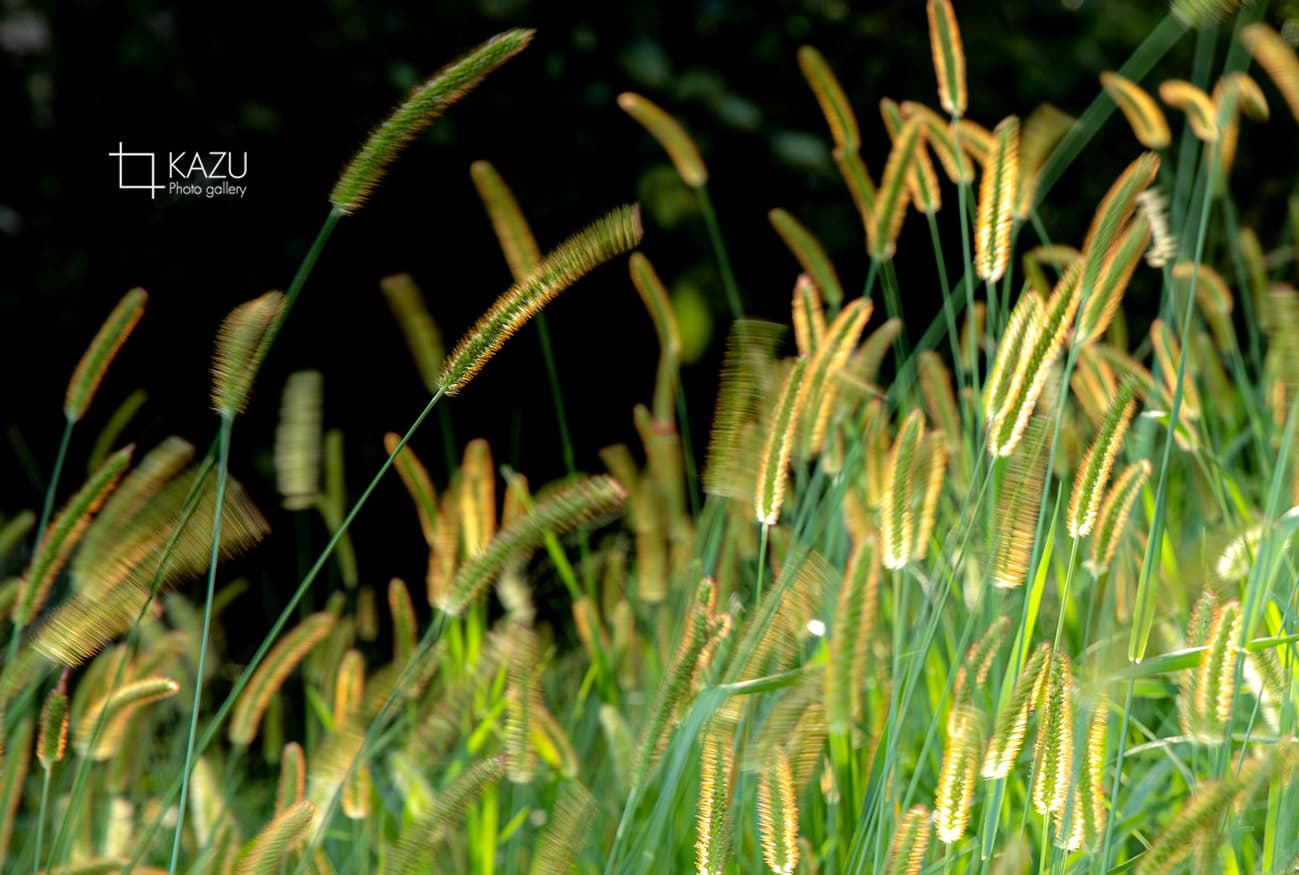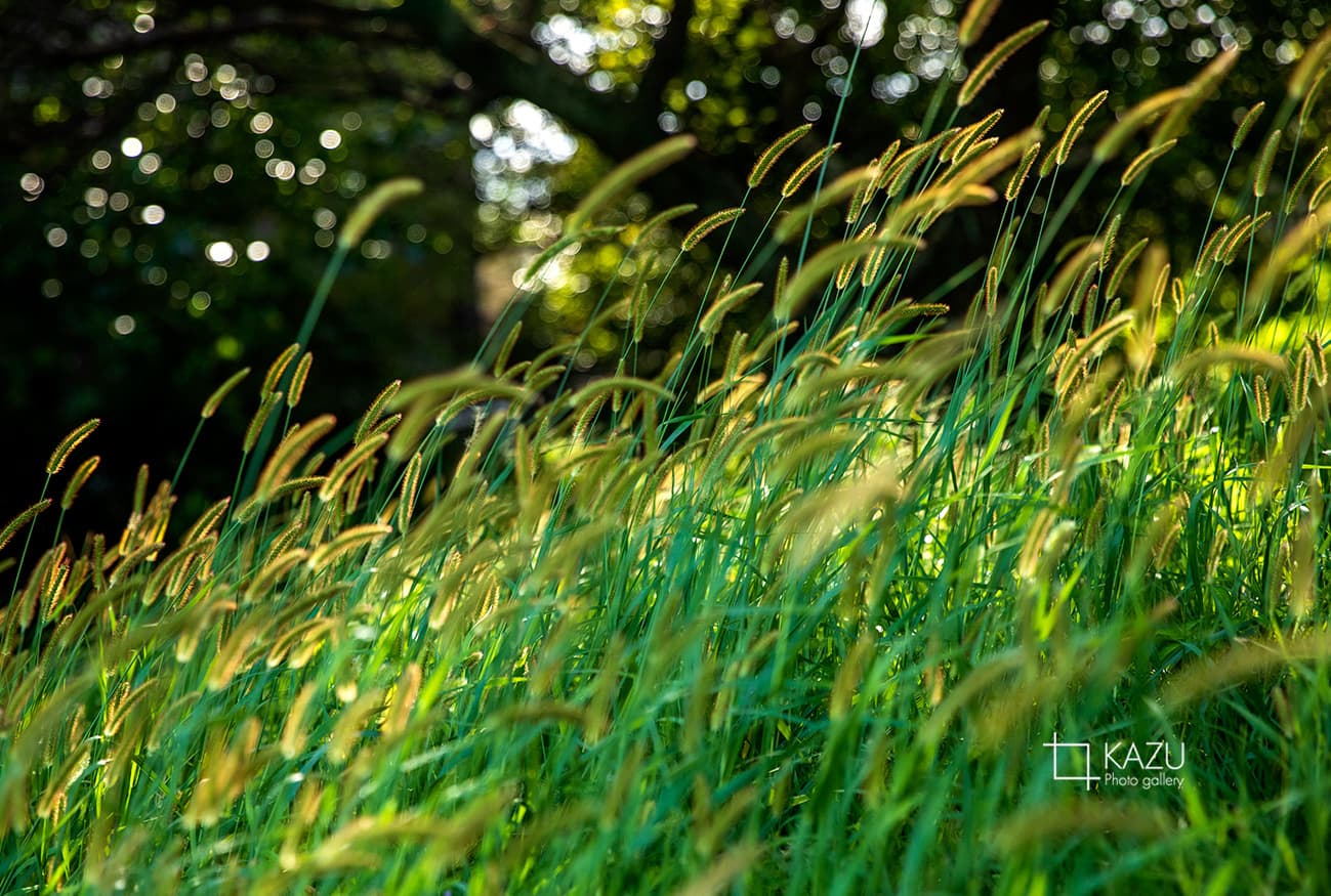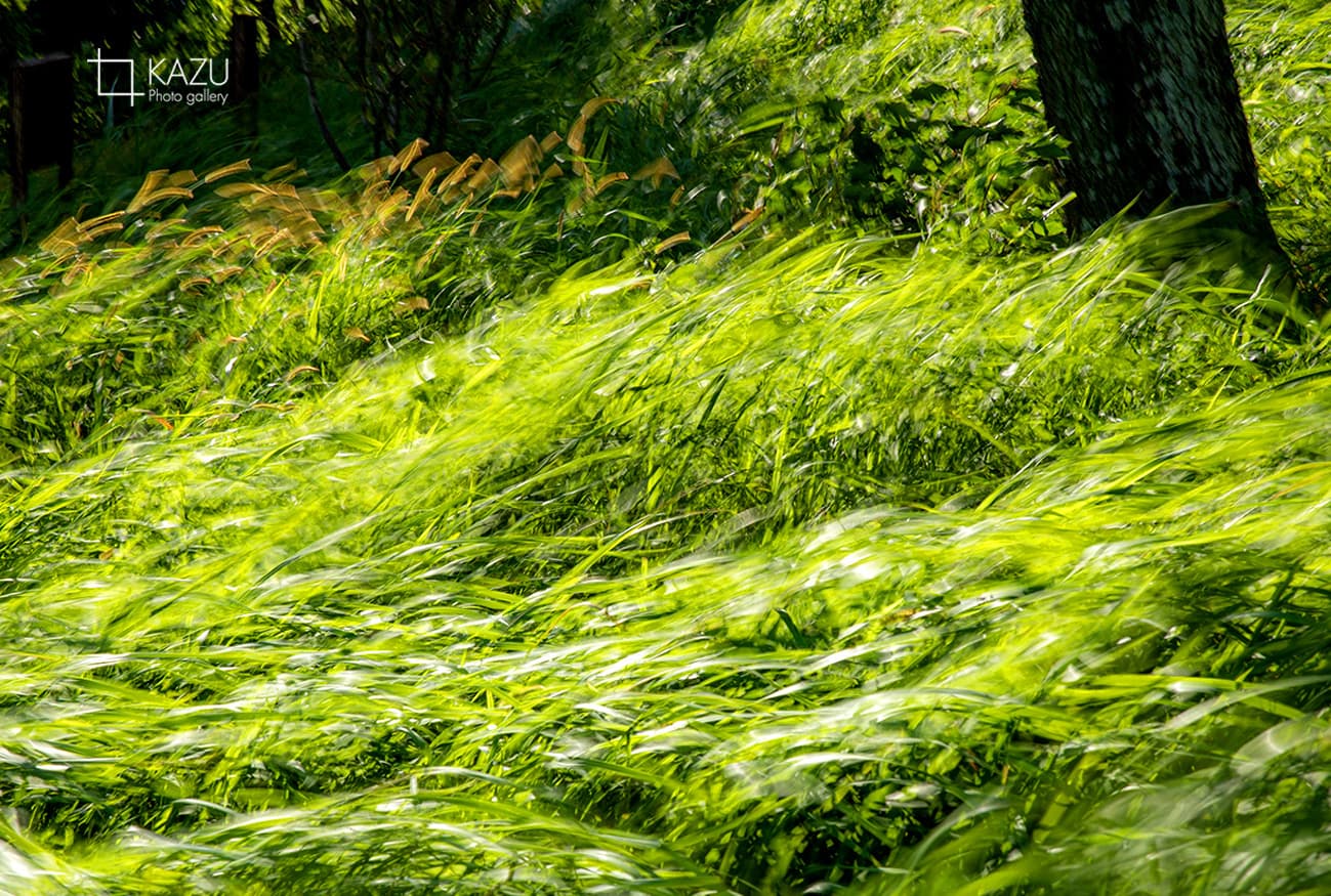 風が強く草木が波打っています