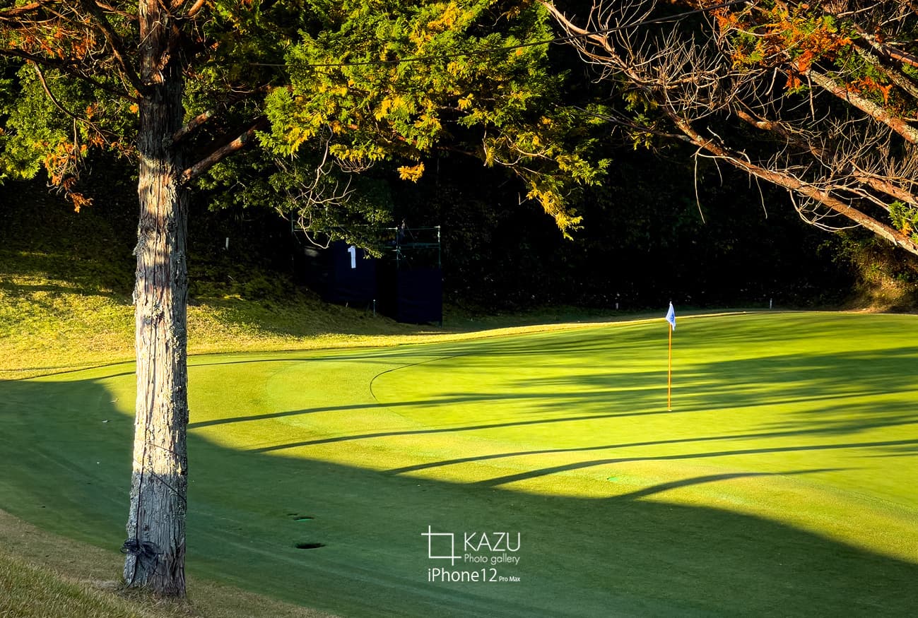 朝の1番ホール影が伸びて静かで雰囲気が良い感じです自分で作ったおにぎり食べながら1組み目がやってくるのを待ちます