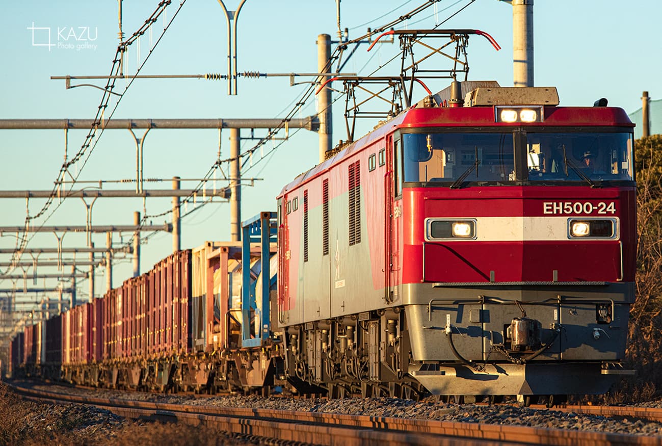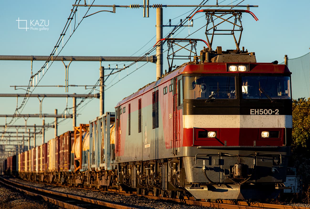 早朝貨物撮影、快晴2号機1エンド積載もよく最高だけれど最後尾がギリギリでちょっとF値が開きすぎ撮りそこなったかな〜