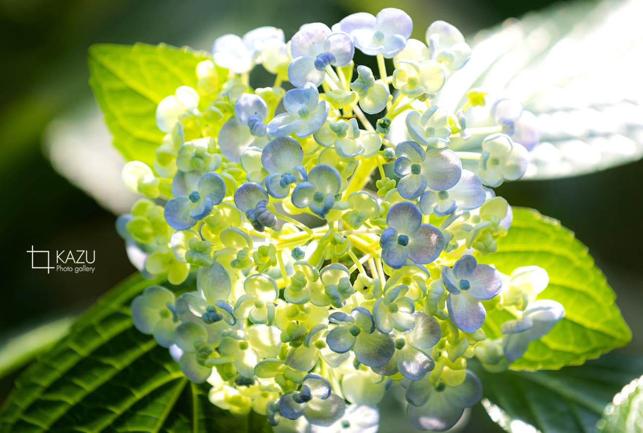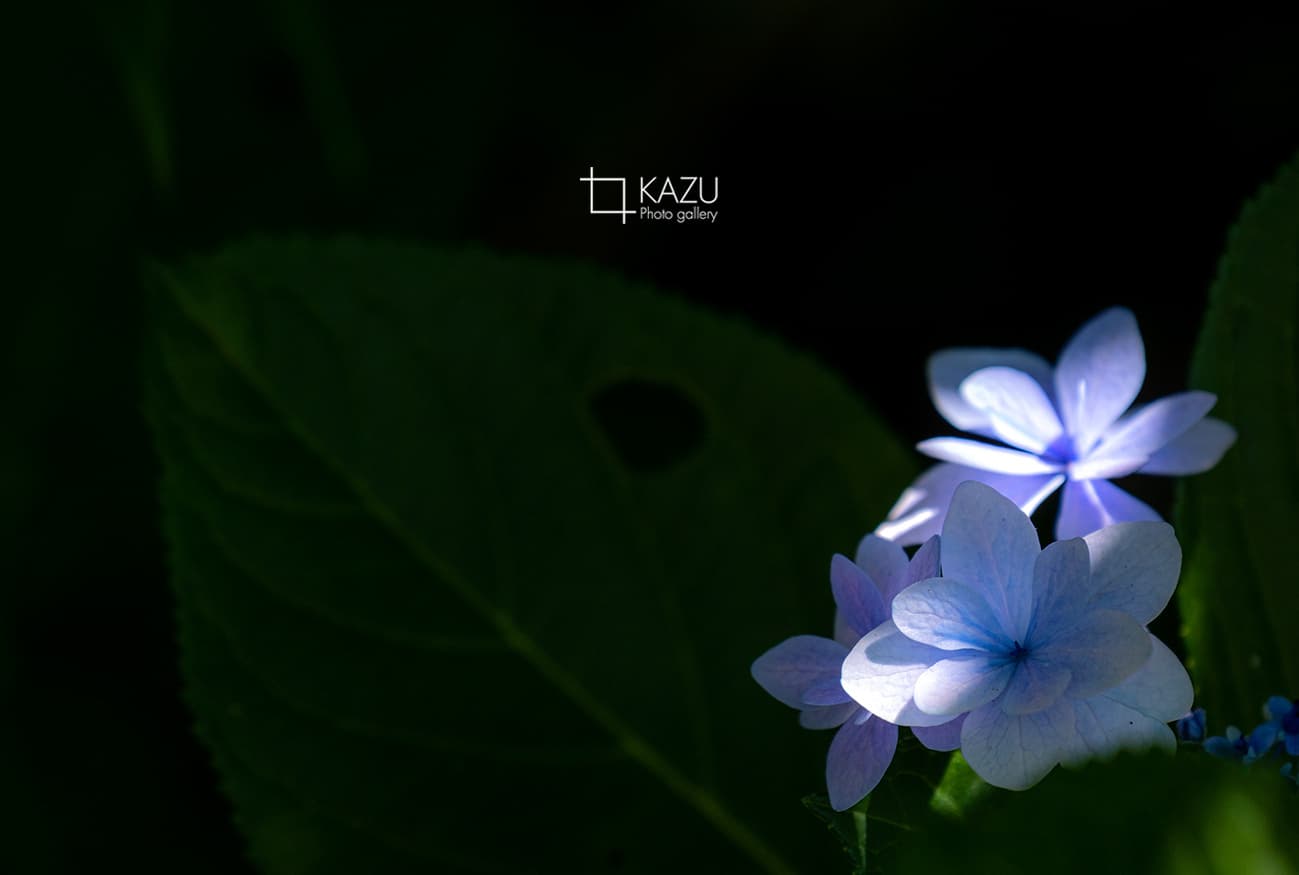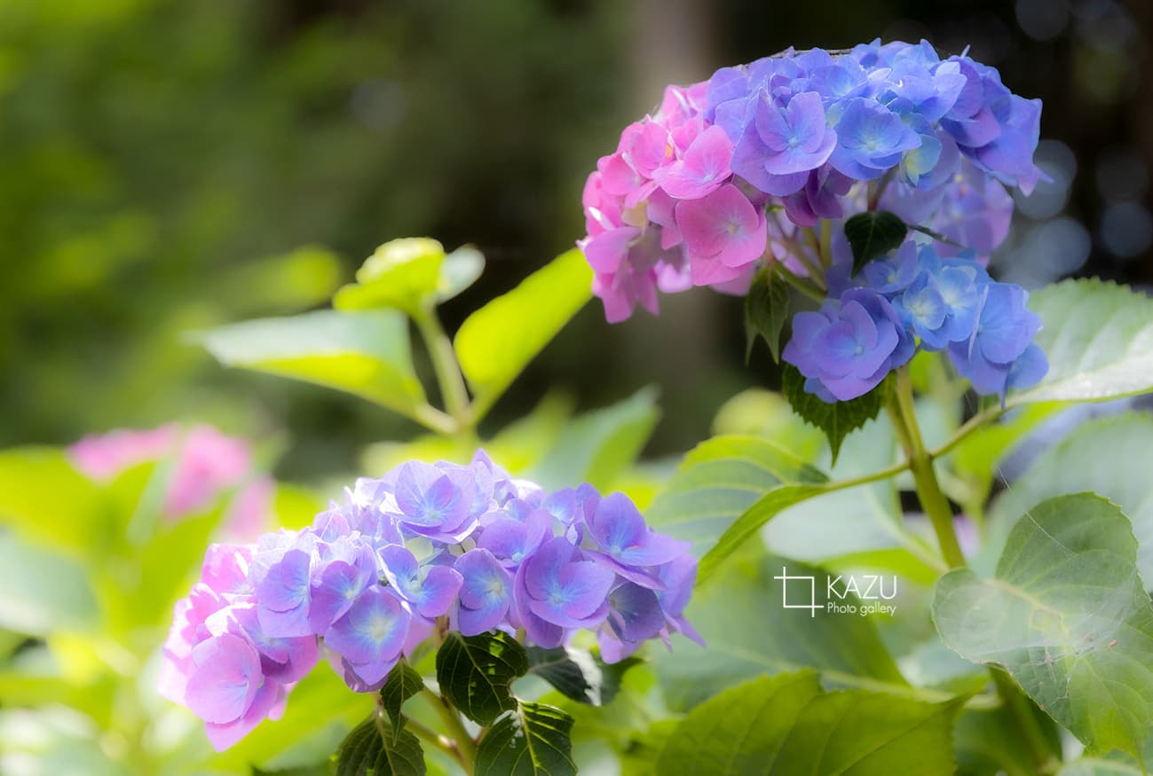 斜光がさしていて紫陽花にスポットライトが、綺麗です