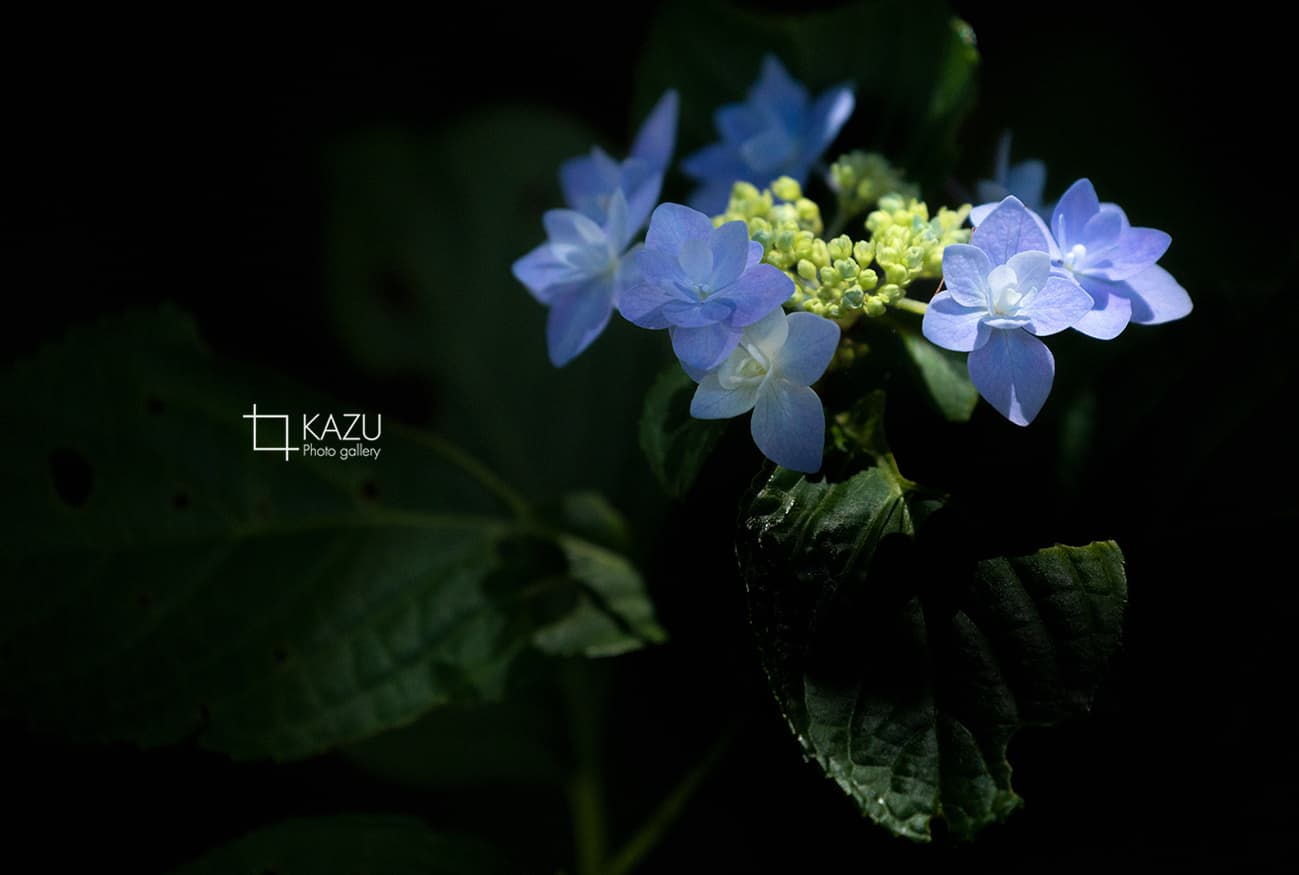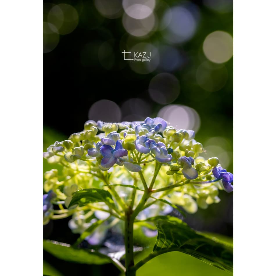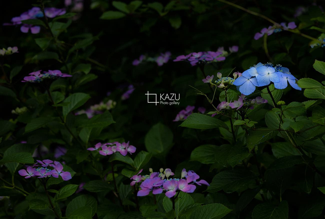斜光がさしていて紫陽花にスポットライトが、綺麗です