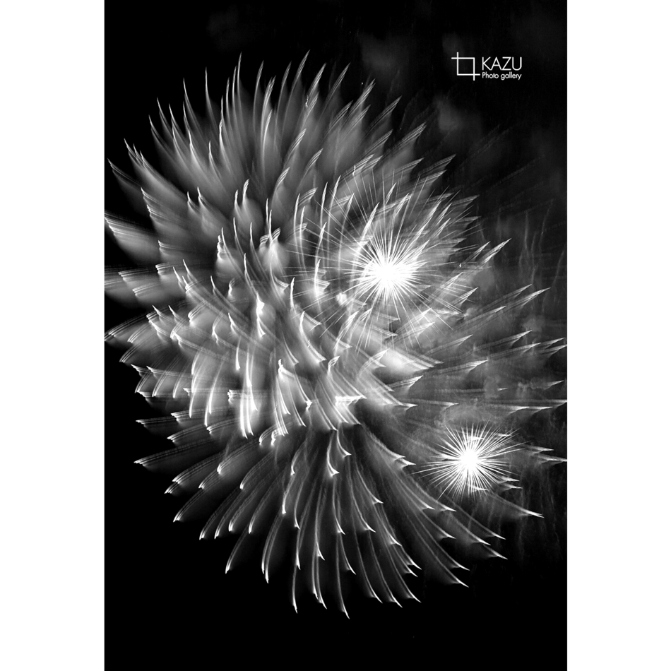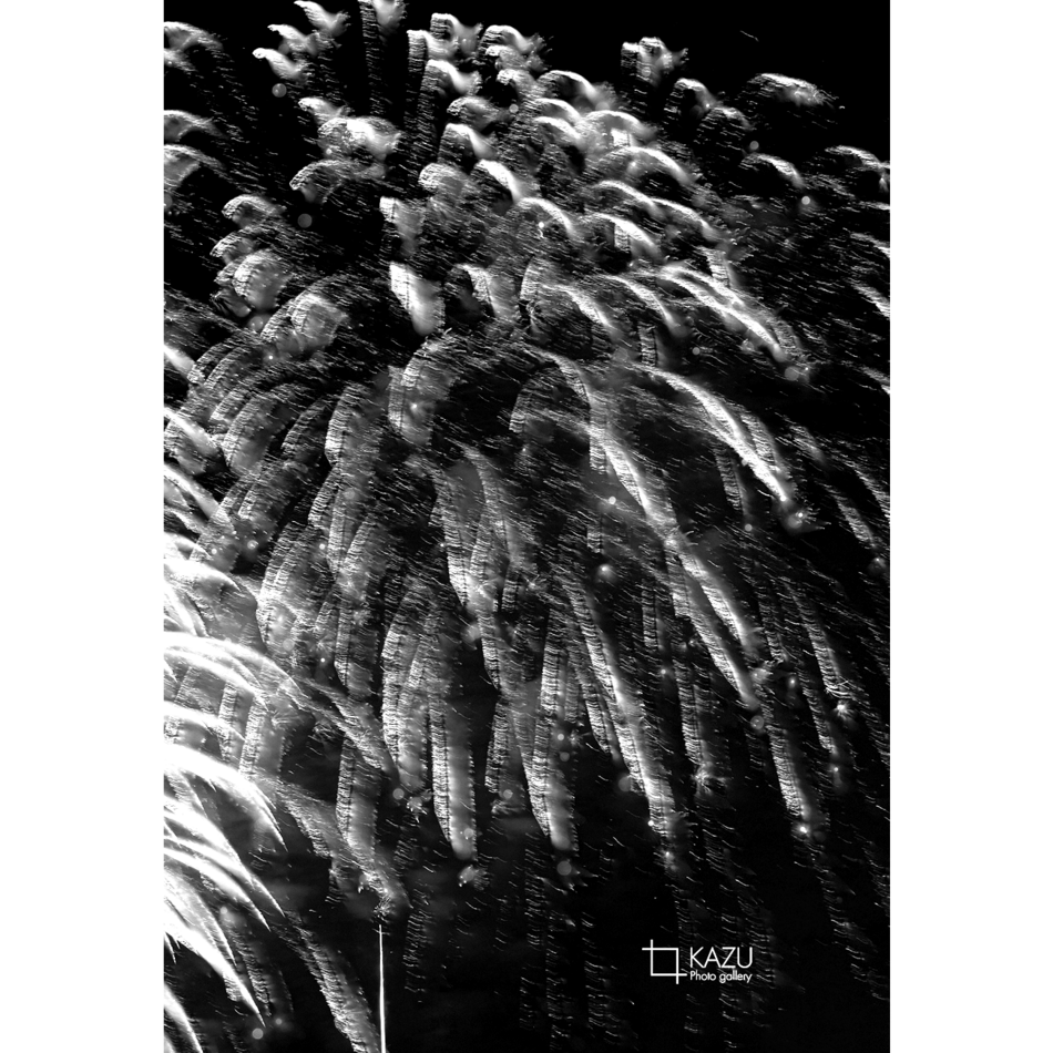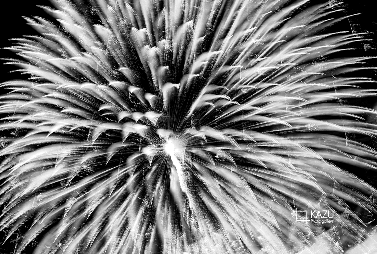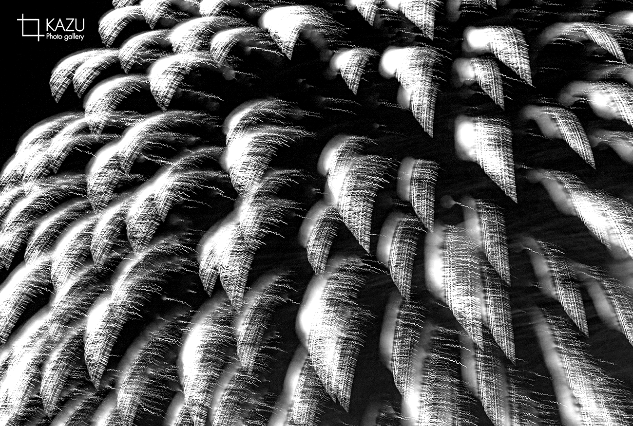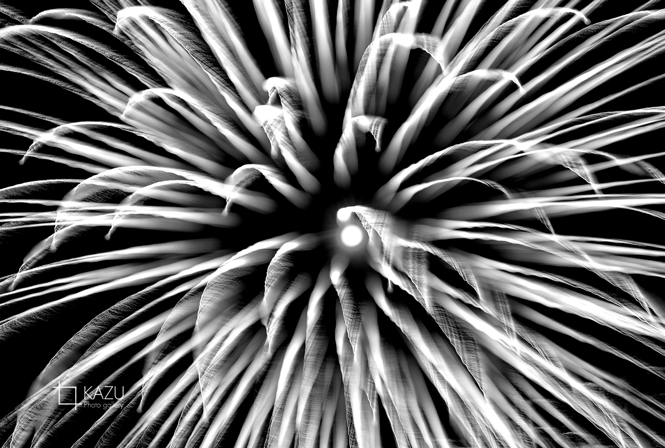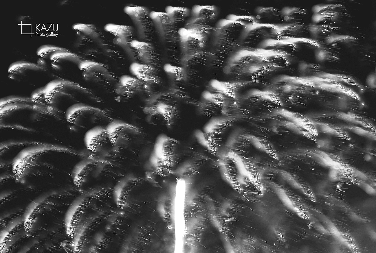 昨日の続き、金色一色の花火をモノクロで見慣れた花火も色を抜くと造形の面白さが見えてきます