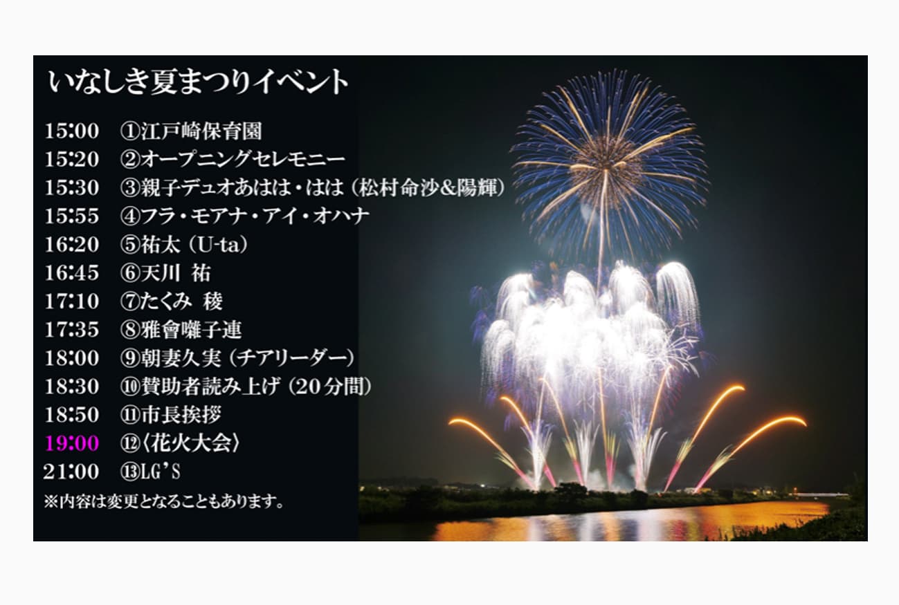 19日は初めての稲敷夏祭り&花火大会に行ってみました駅からバスの場合50分渋滞でもっとかかるでしょうなので無料駐車場が多く用意されています3:30頃に着いた時には近場の駐車場は満車で会場から1.2kmの駐車場に止めました結局帰りは少し離れた駐車場なのであまり渋滞に巻き込まれず帰れました。