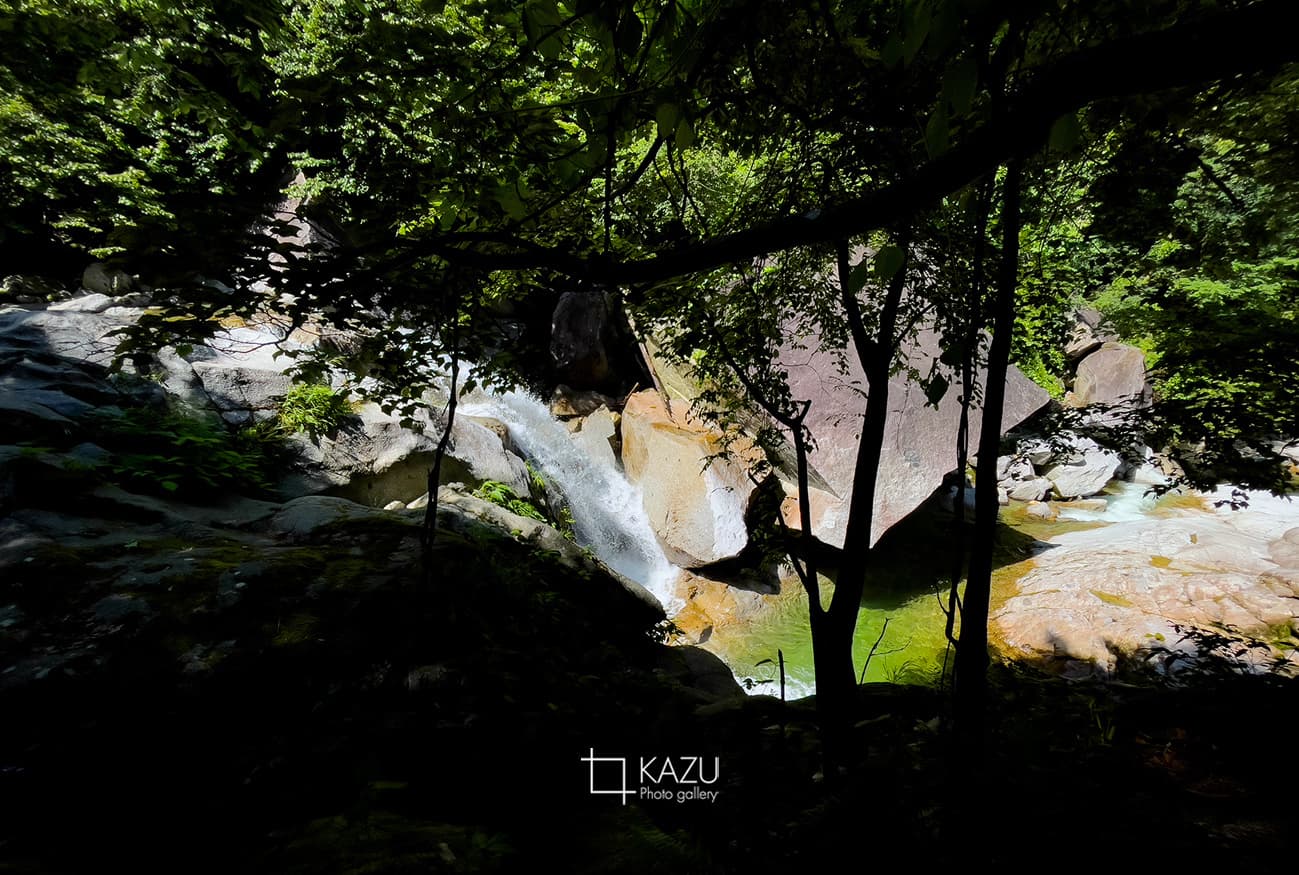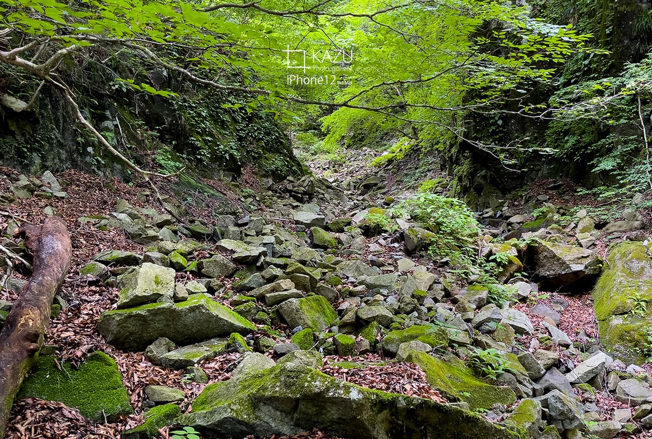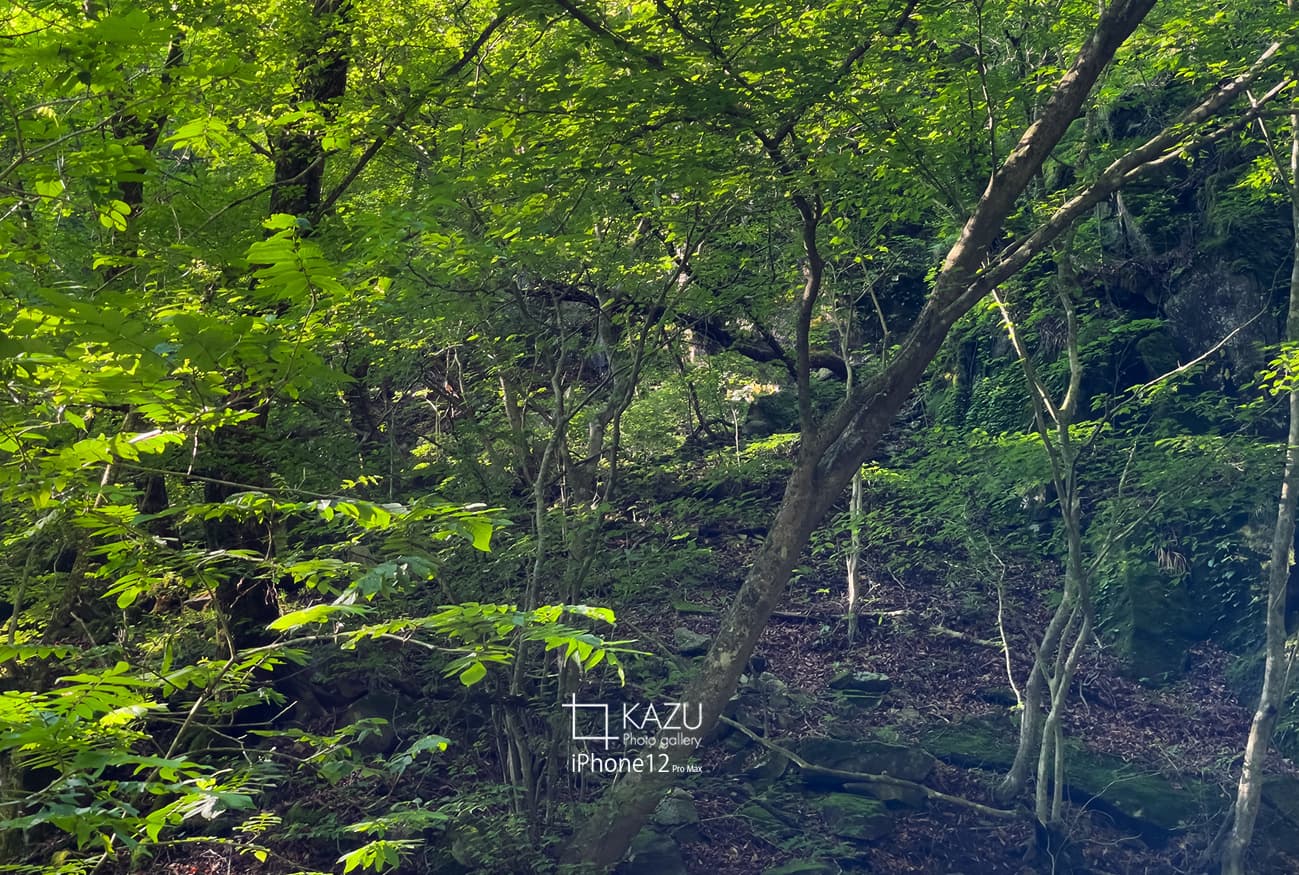 日がだいぶ差してきて影がきつくなるのでまた後で来る事にして滝壺にチャレンジです、ネットで動画を見たり色々調べて2ルート+1あるようなので行きは急斜面を下り帰りは急勾配の登りガレ場ルートで一周してみました、下り急勾配は一部座りながら段差に注意しながら下ります道も分かりづらく滝壺に着いた時はホッとしました