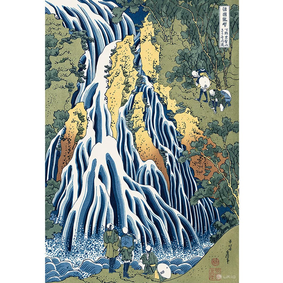 北斎の浮世絵、上のカットが一番雰囲気似てる感じ、170年くらい前で木がなかったのでしょう滝の中腹にも人がいます、本当に登れたのか想像なのか考えてるだけで楽しい