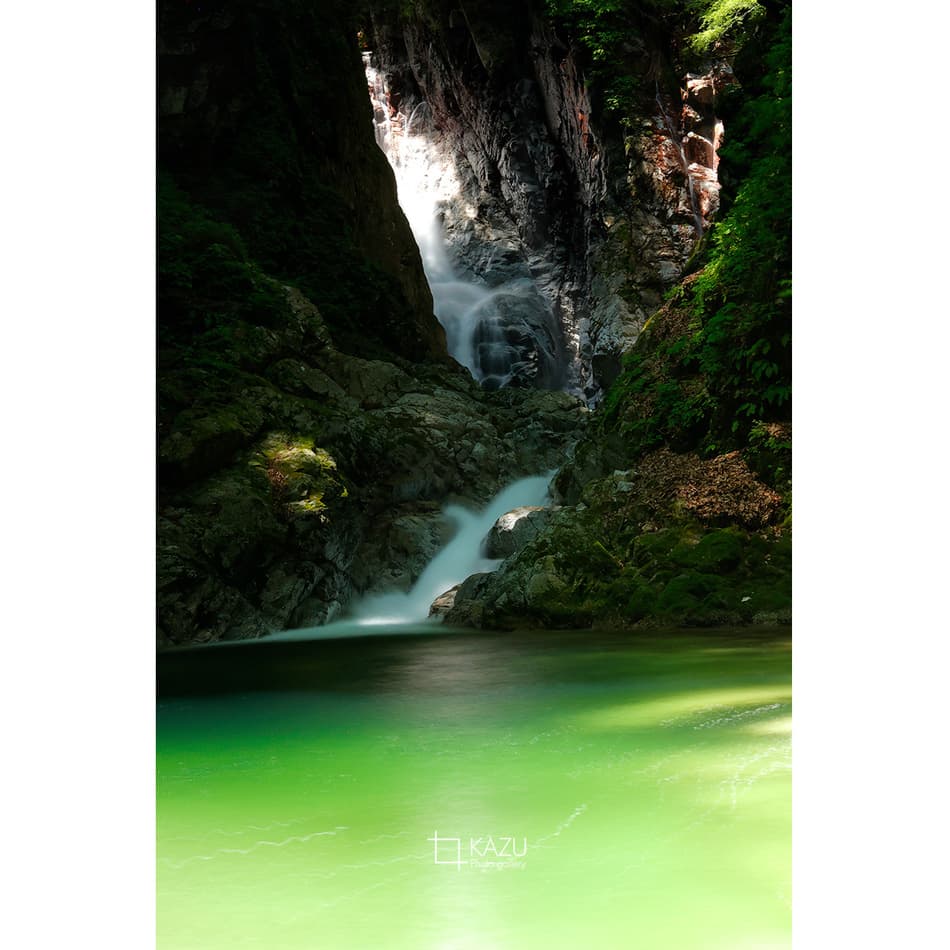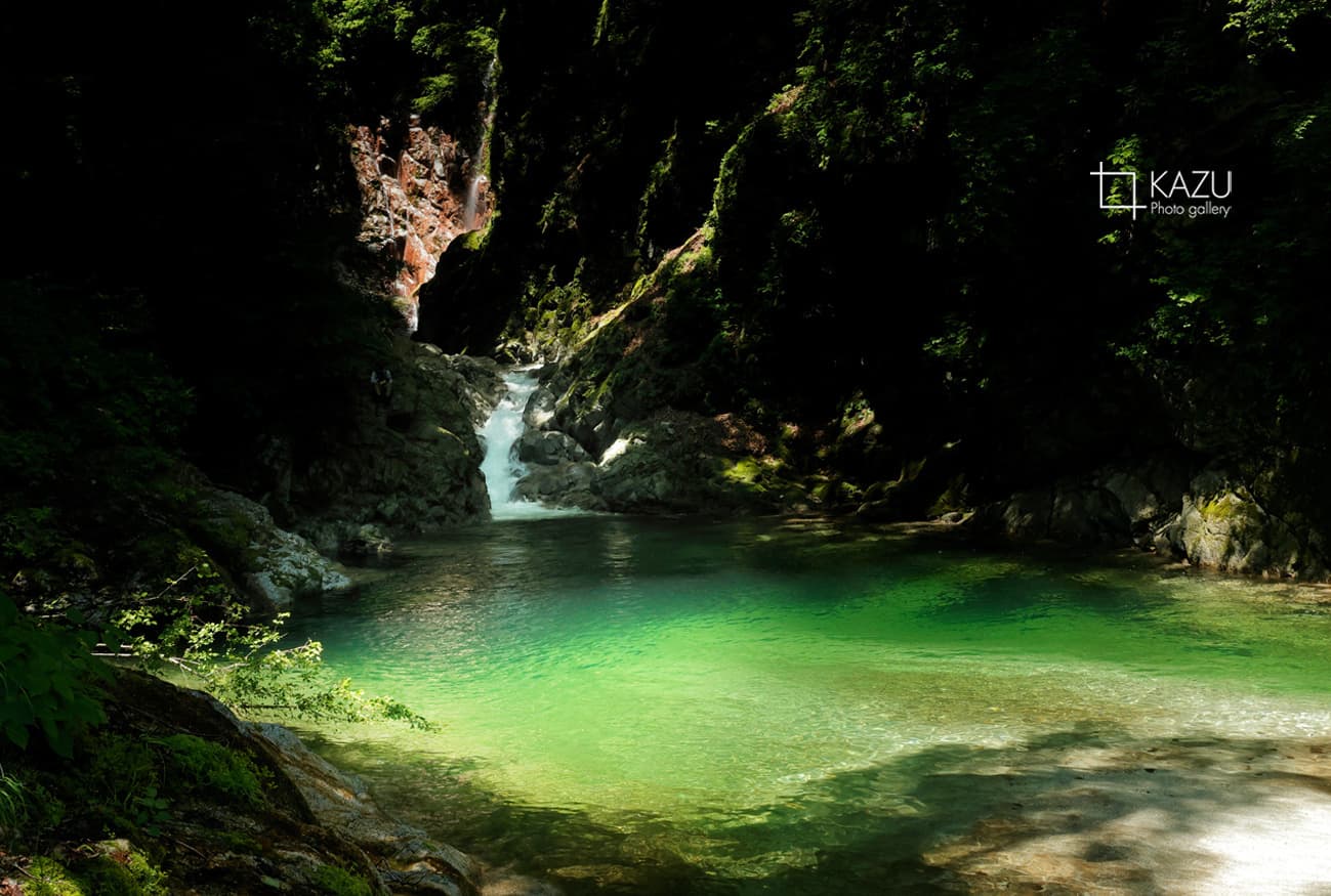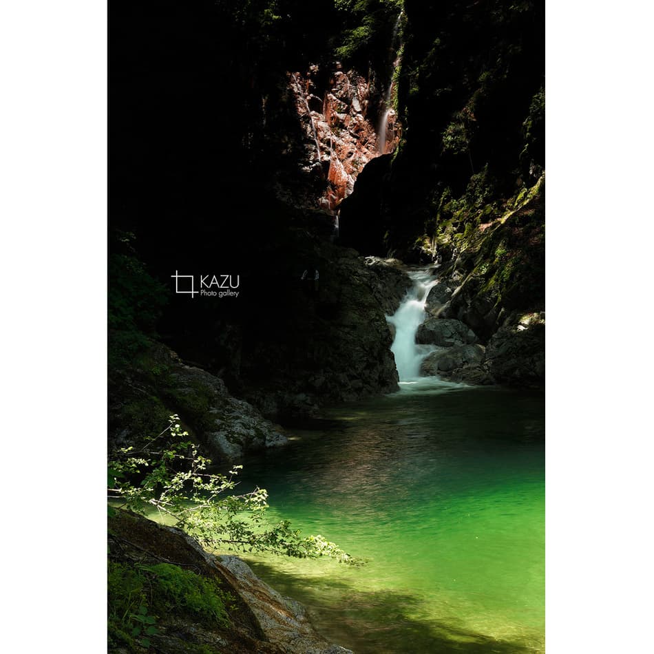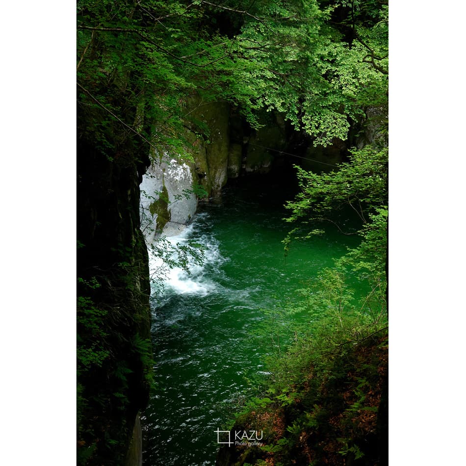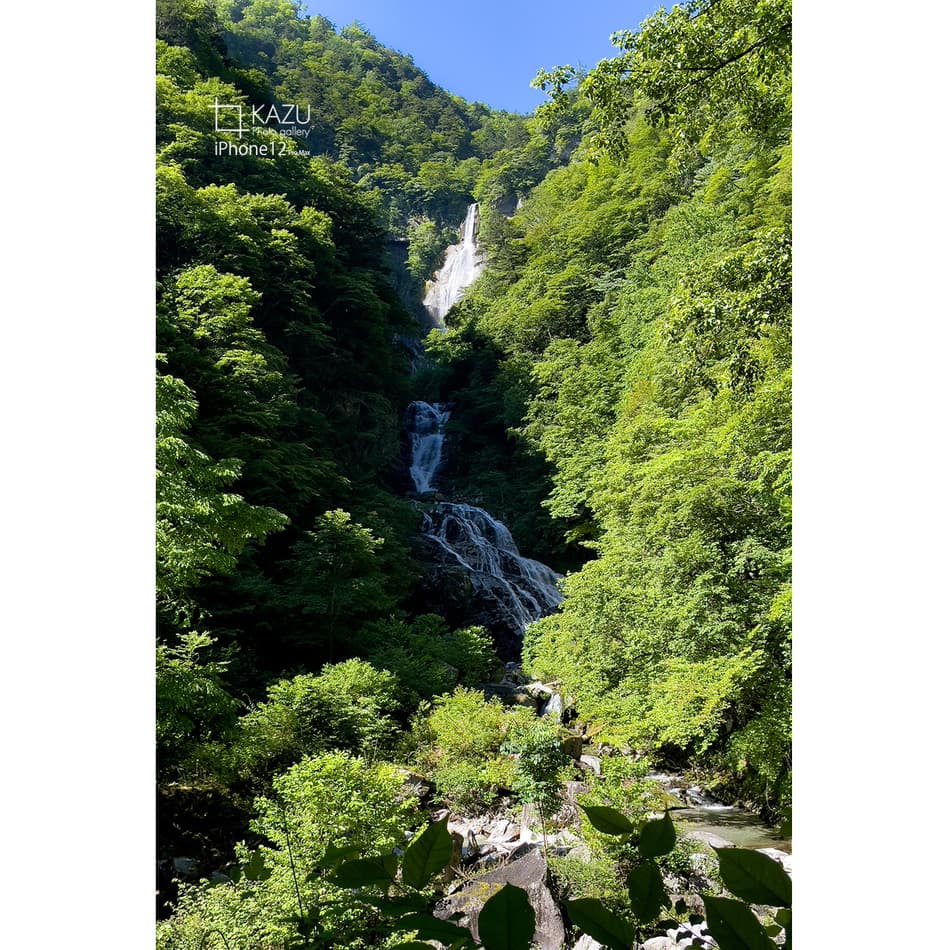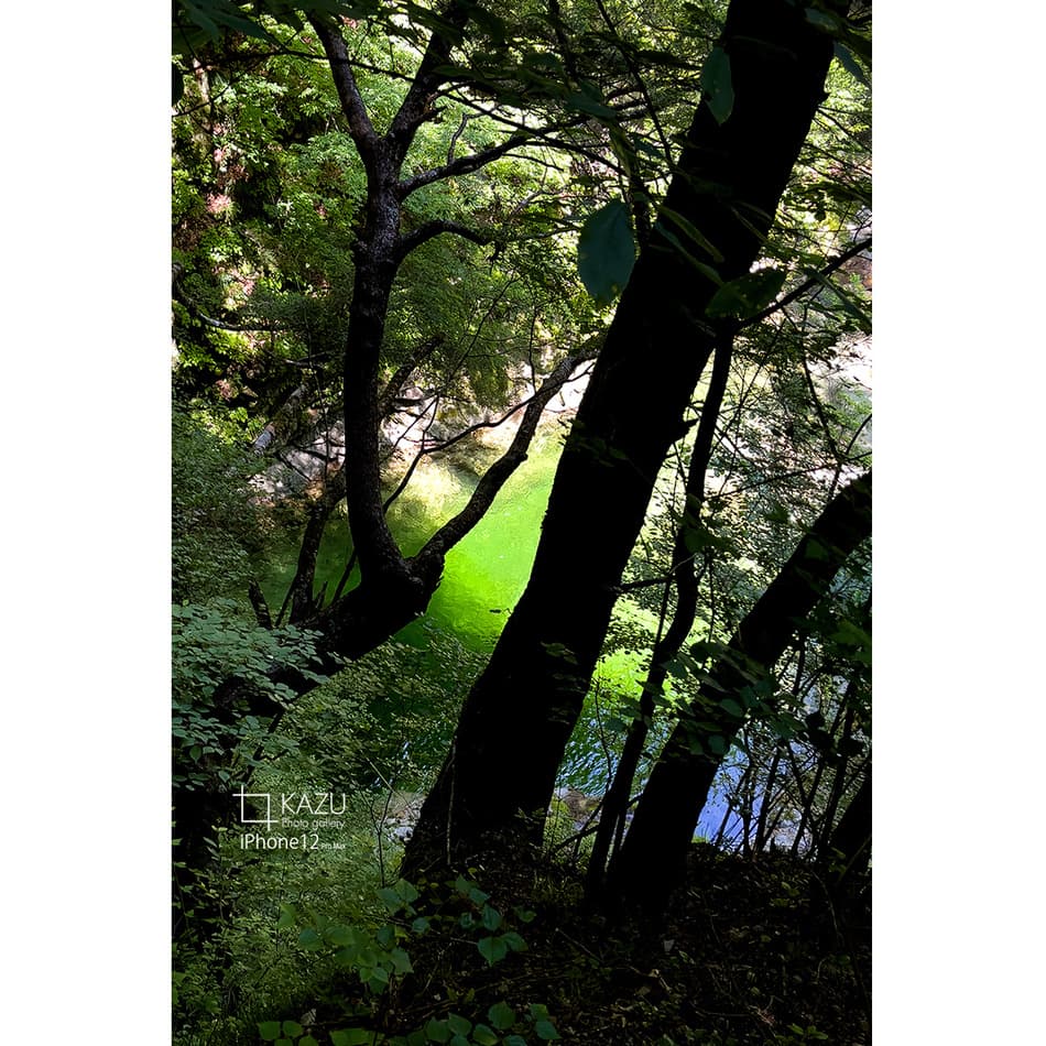 どうせたした事ないだろうと行ってみると一目で虜になりました、エメラルドグリーのグラデーションと景色に奥行きがあってずっと見ていられる景色です、淵に釣りのおじさんと周りには子供達が遊んでいて良い感じです、今度は淵を登って奥の滝を見てみたいです