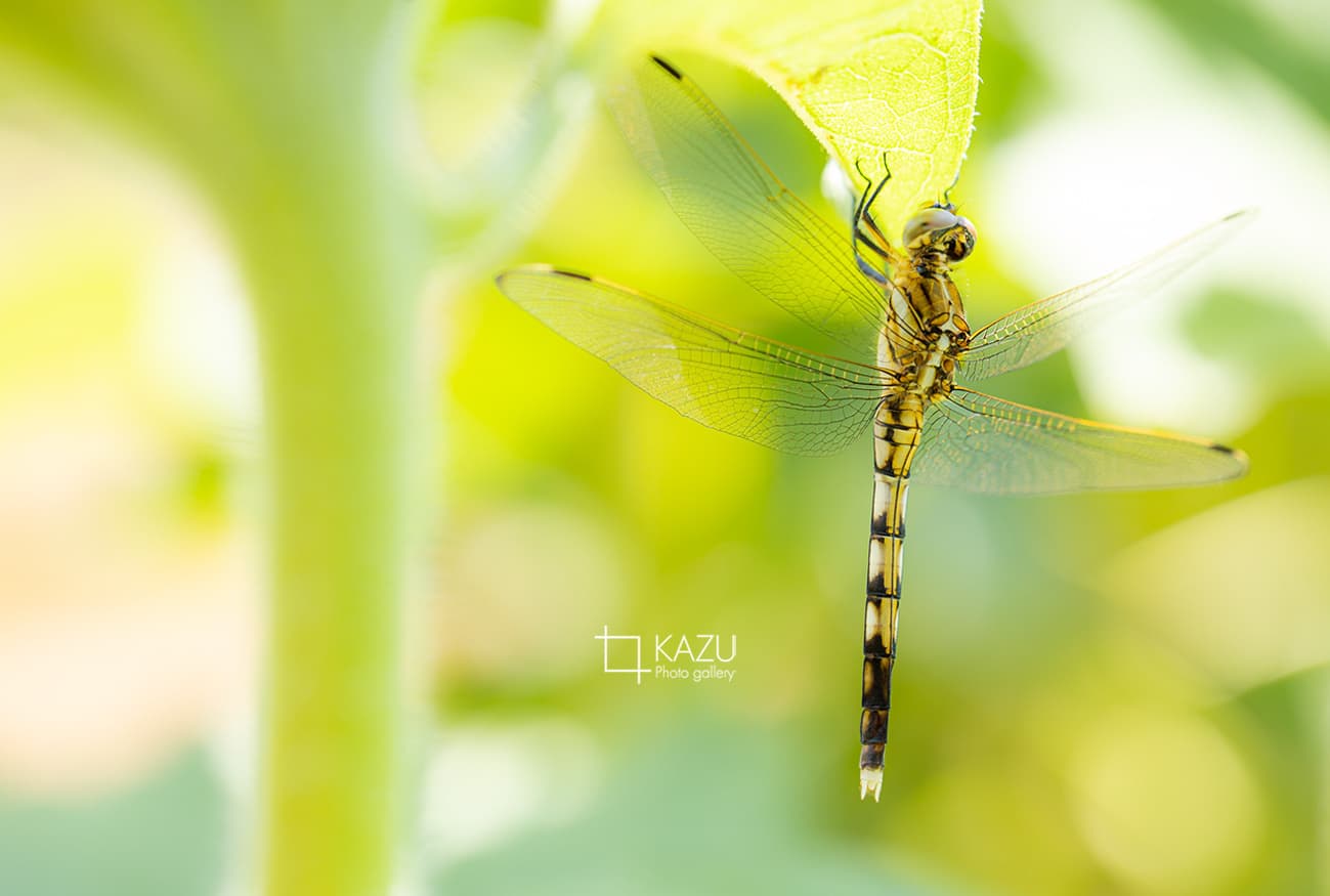 今日も暑いな〜、トンボ君もヒマワリの葉を日傘がわりにしていました