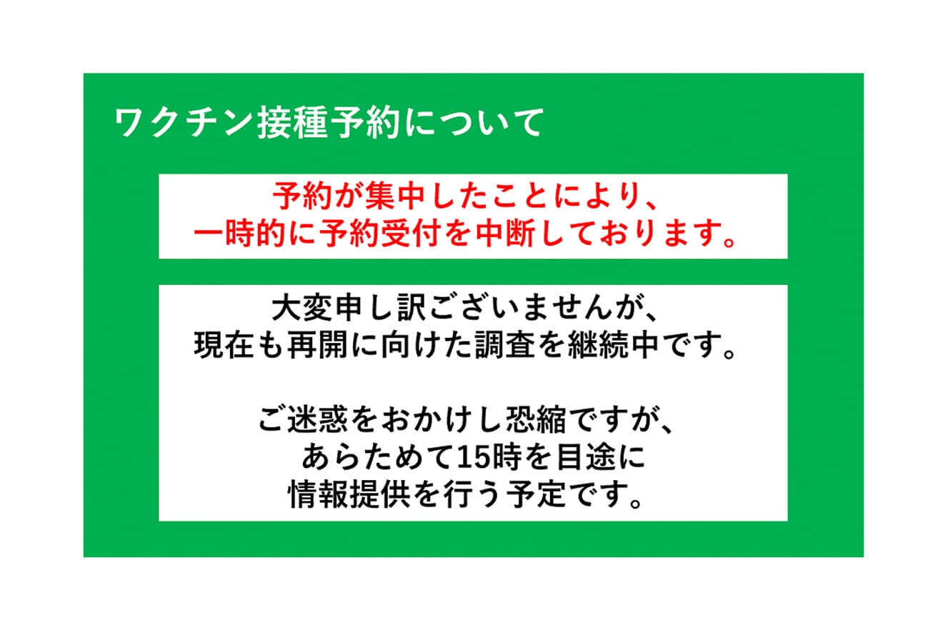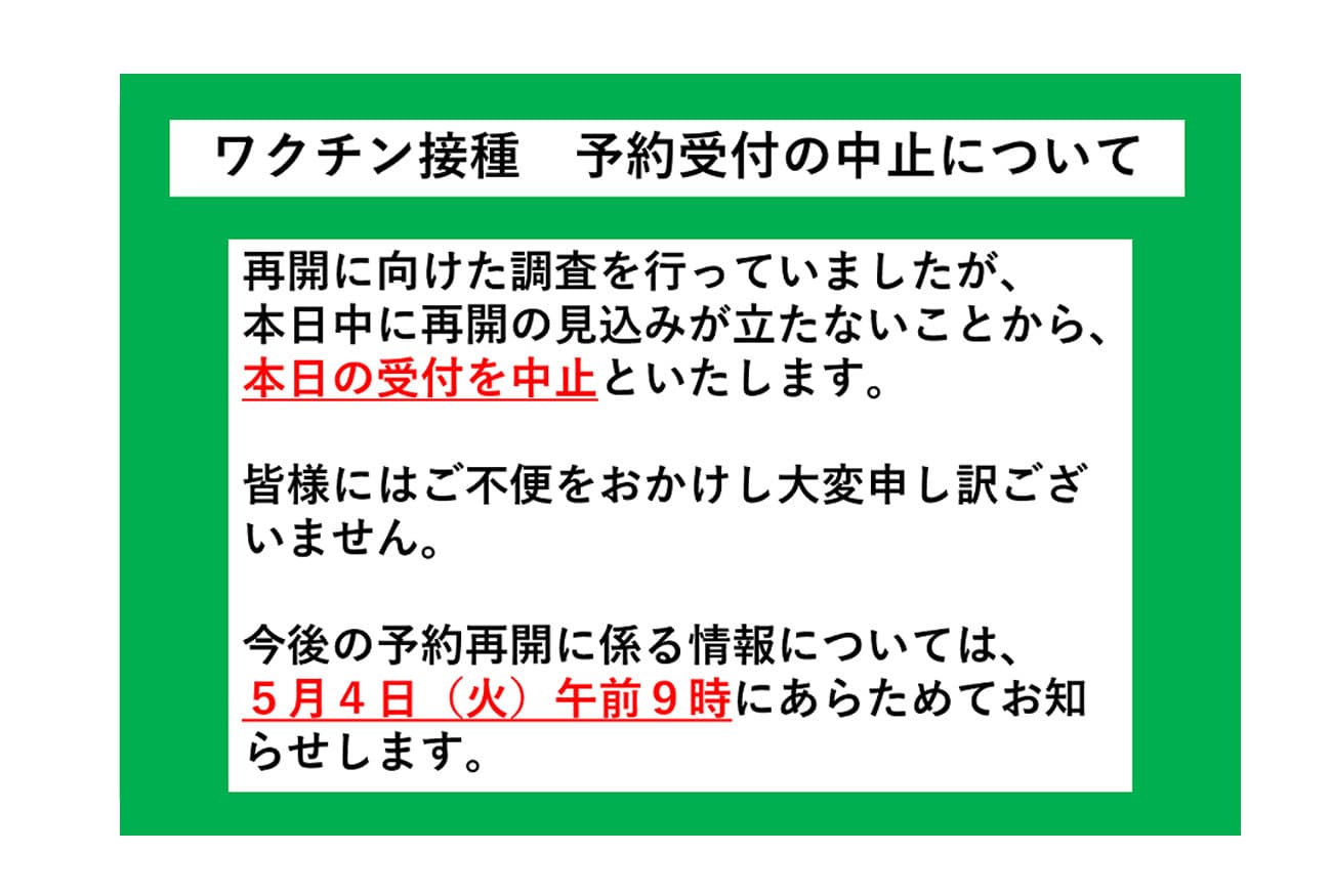 実家の親のワクチン接種日の予約手続きが中止になりました、そりゃそうですよねそんなに大きなシステムを組んでるとも思えないし、実家の弟夫婦は電話予約こちらは息子とパソコン3台でネット予約他の家庭も同じ様なことやってるので無理ですよね、最初から方法を考えて欲しいものです、今日の1日を返して欲しいけどどうせ暇なのでよしとしましょう