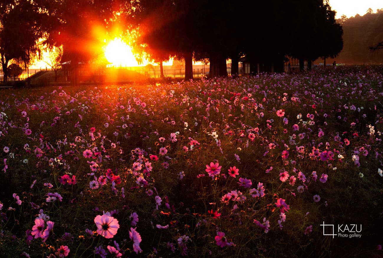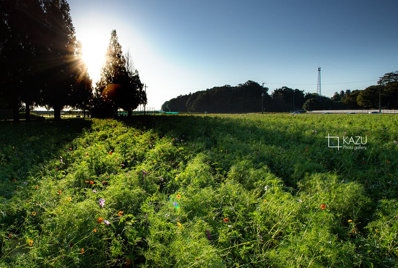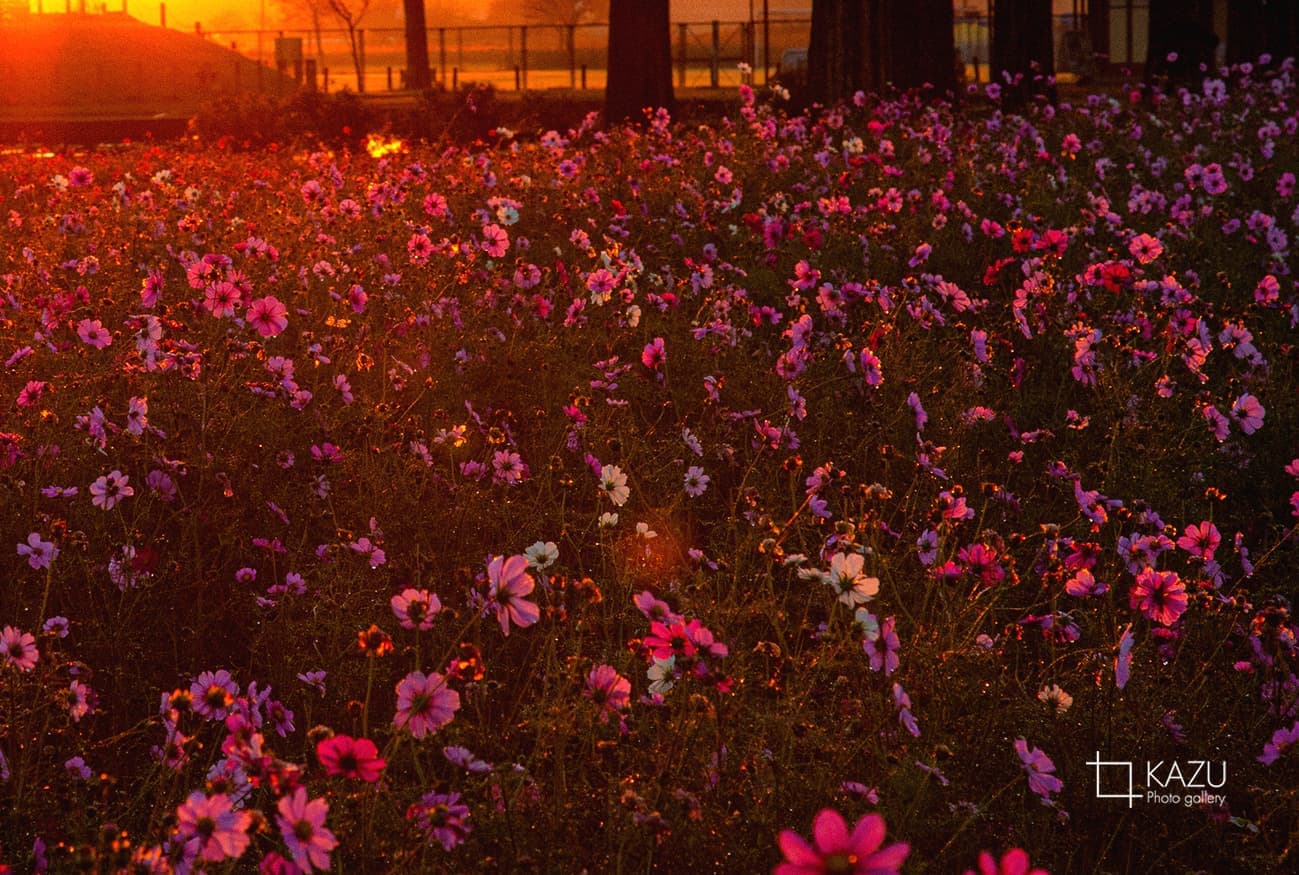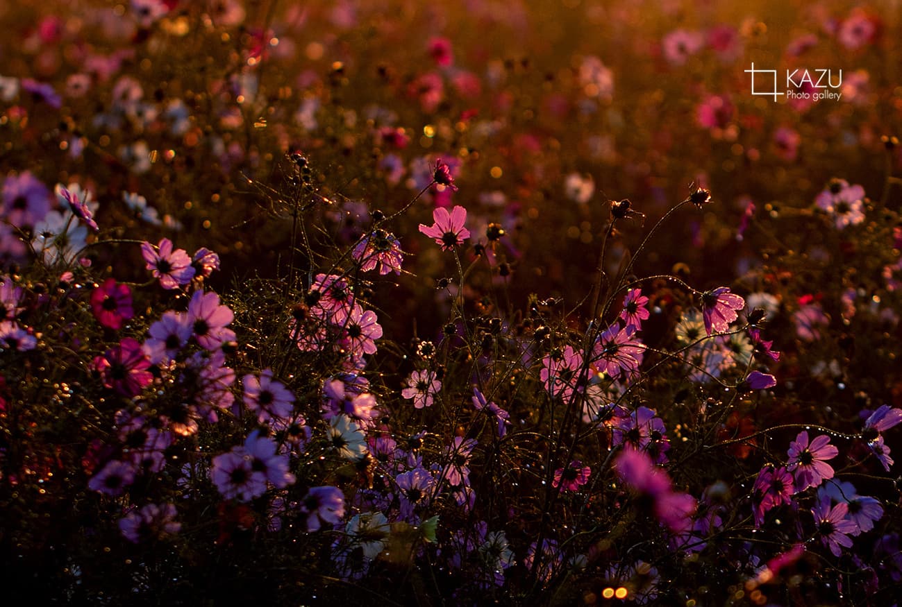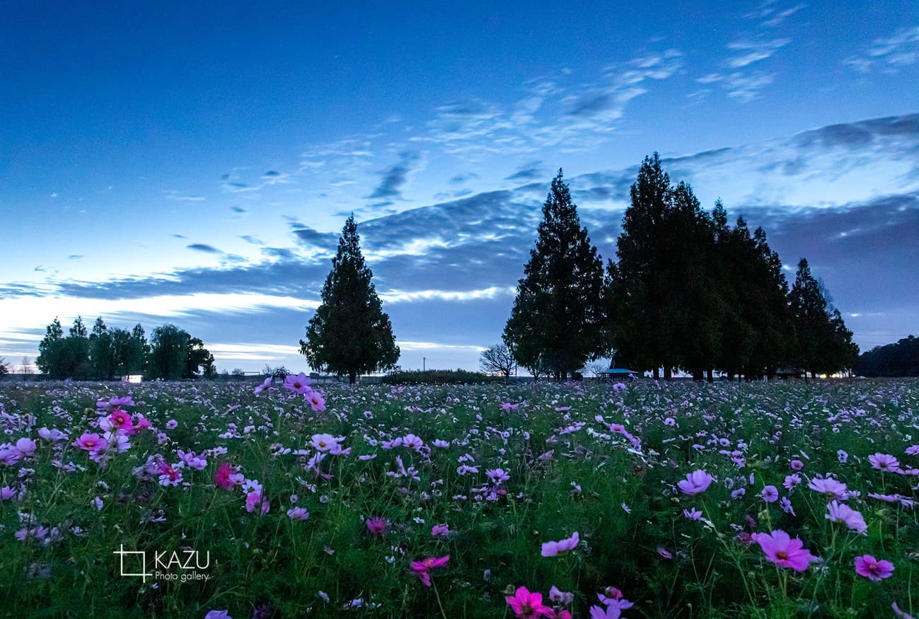 今日は人が全然いません、天気予報のせいか公園が月曜日休みのせいか7時になると2〜3人いた撮影者も帰ってしまって私一人です、私一人のコスモス畑。