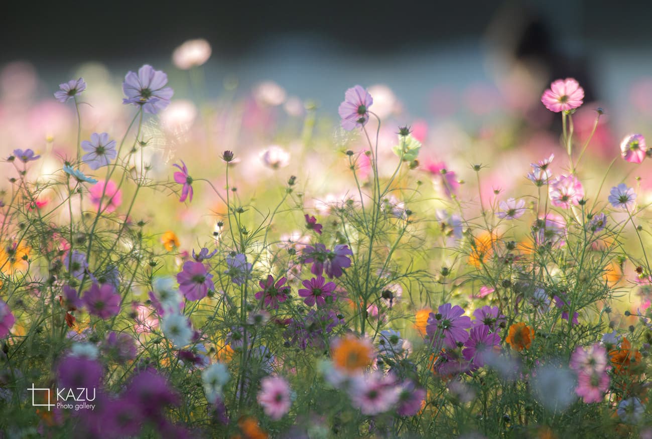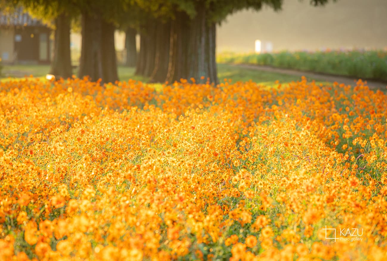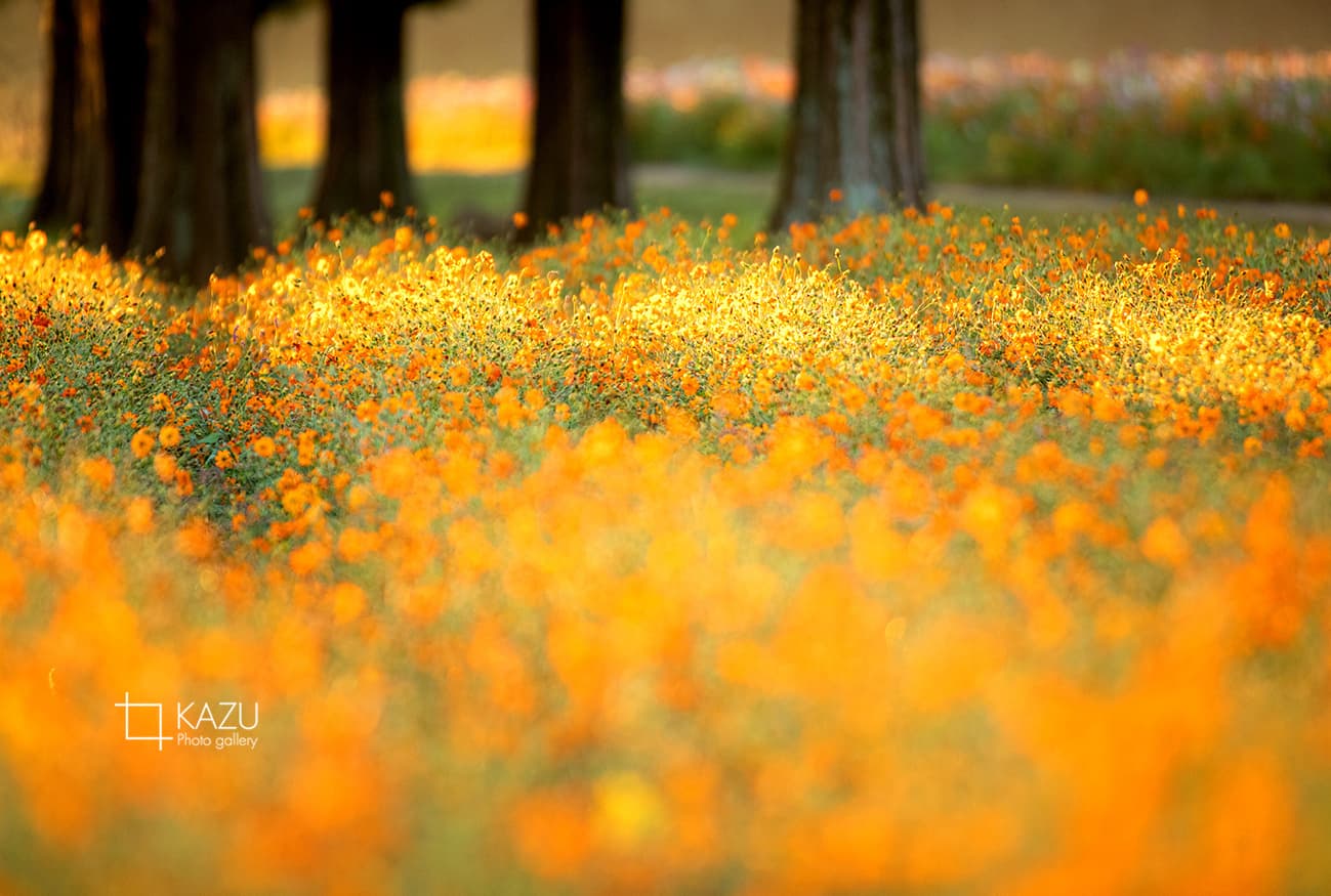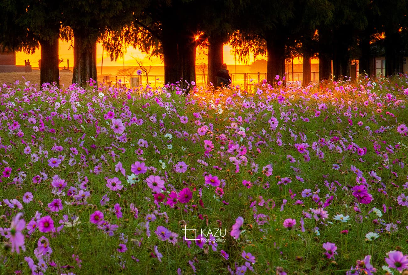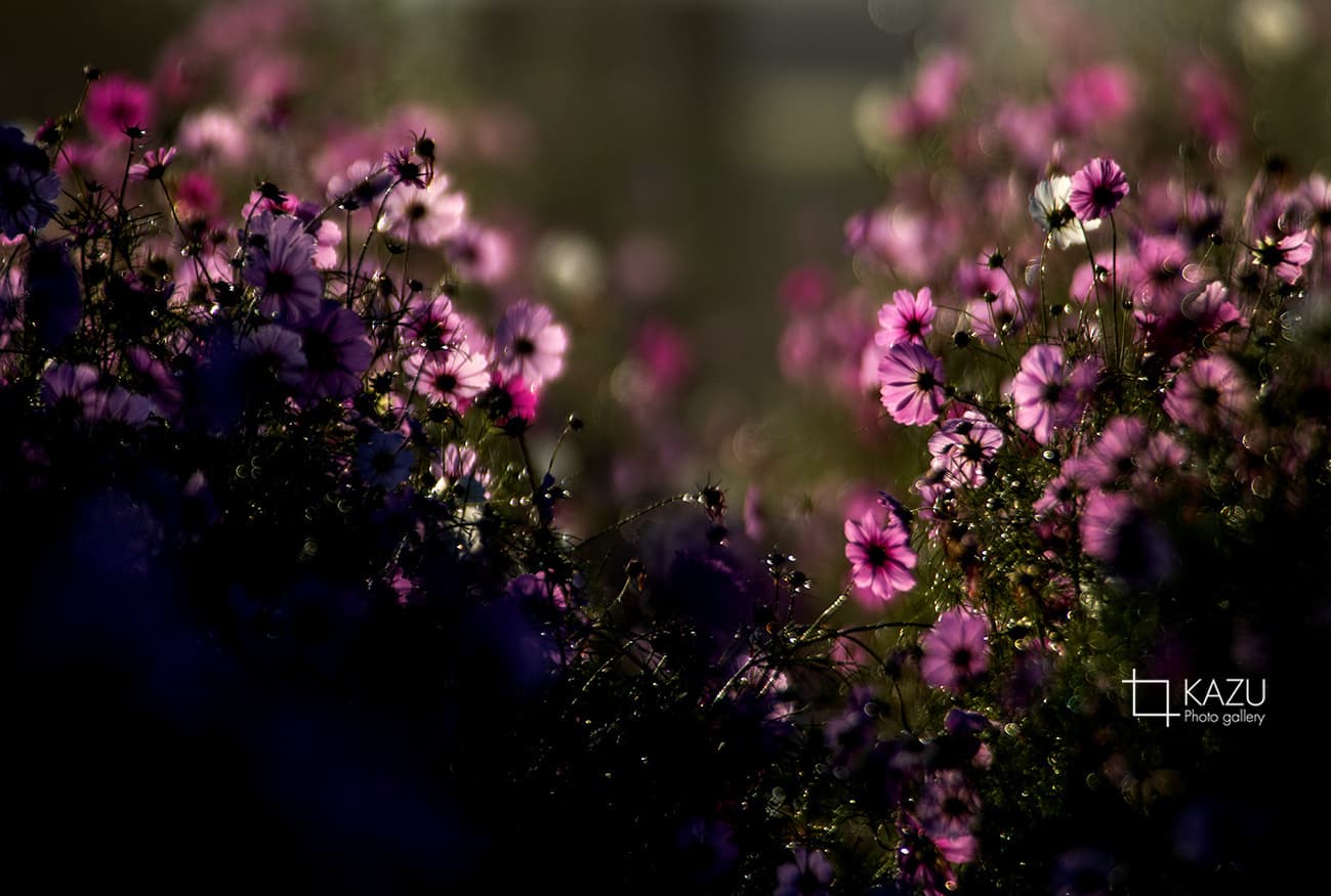 今日は人が全然いません、天気予報のせいか公園が月曜日休みのせいか7時になると2〜3人いた撮影者も帰ってしまって私一人です、私一人のコスモス畑。