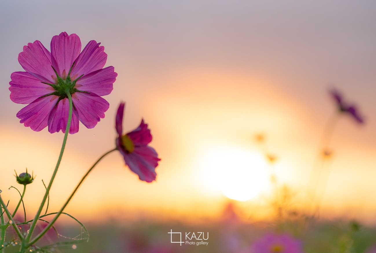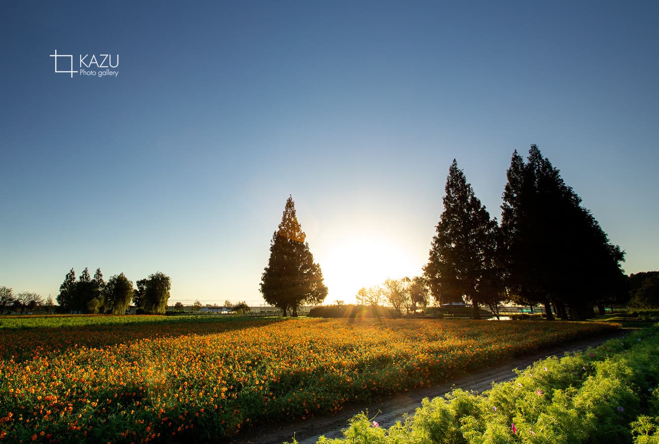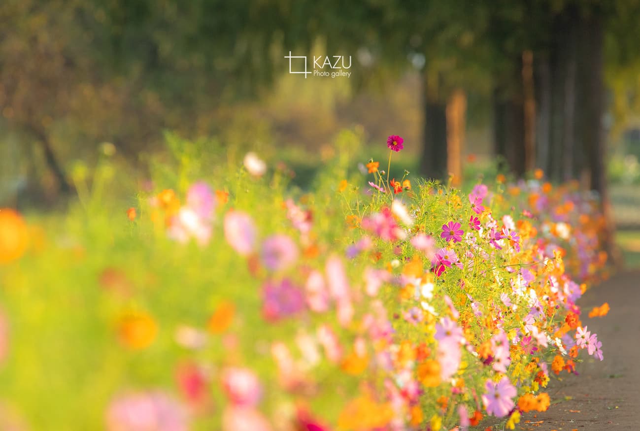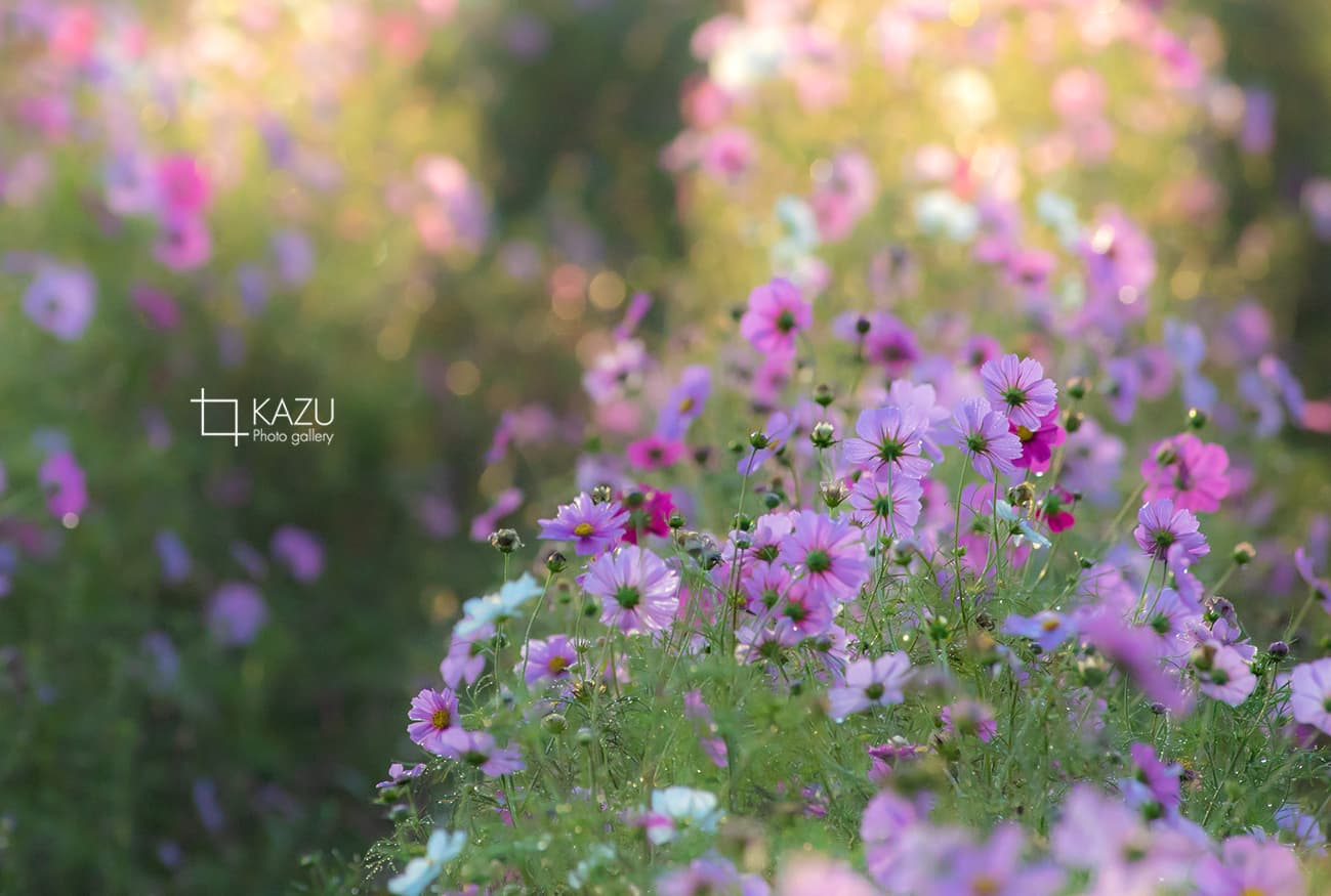 今日は人が全然いません、天気予報のせいか公園が月曜日休みのせいか7時になると2〜3人いた撮影者も帰ってしまって私一人です、私一人のコスモス畑。