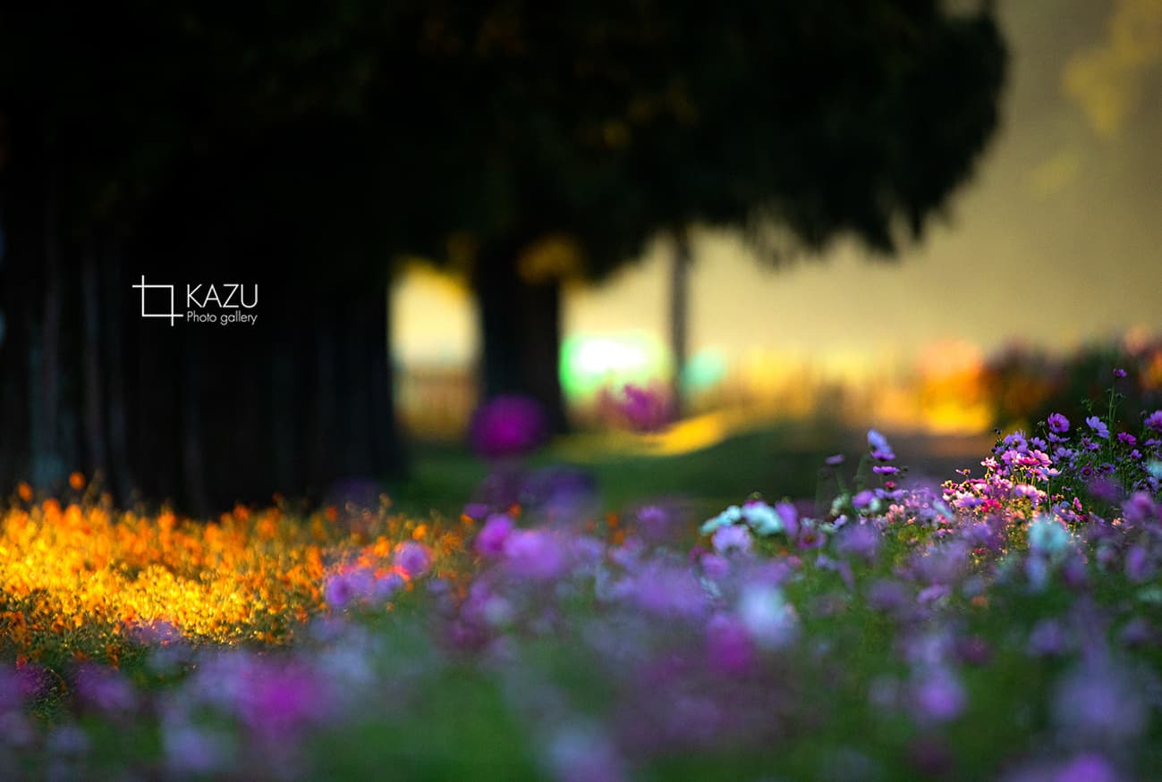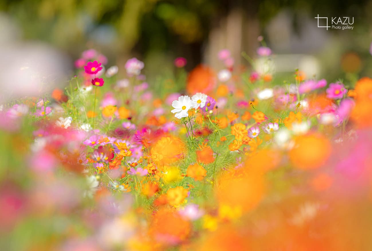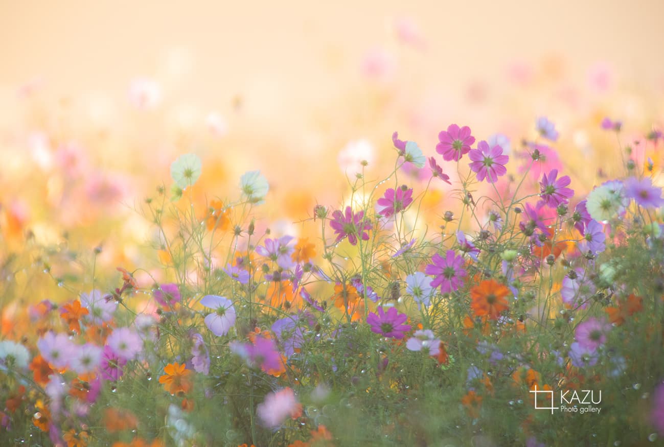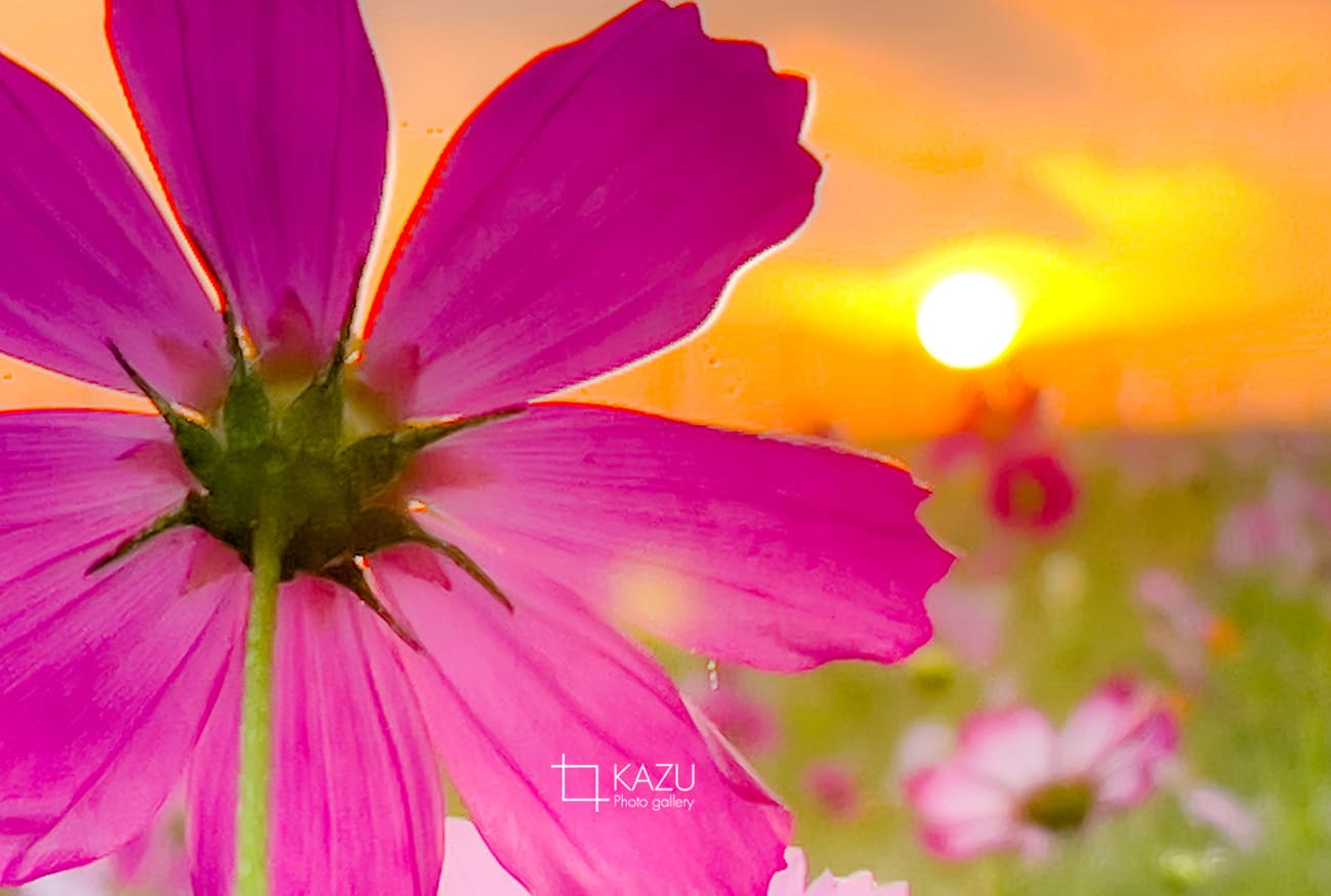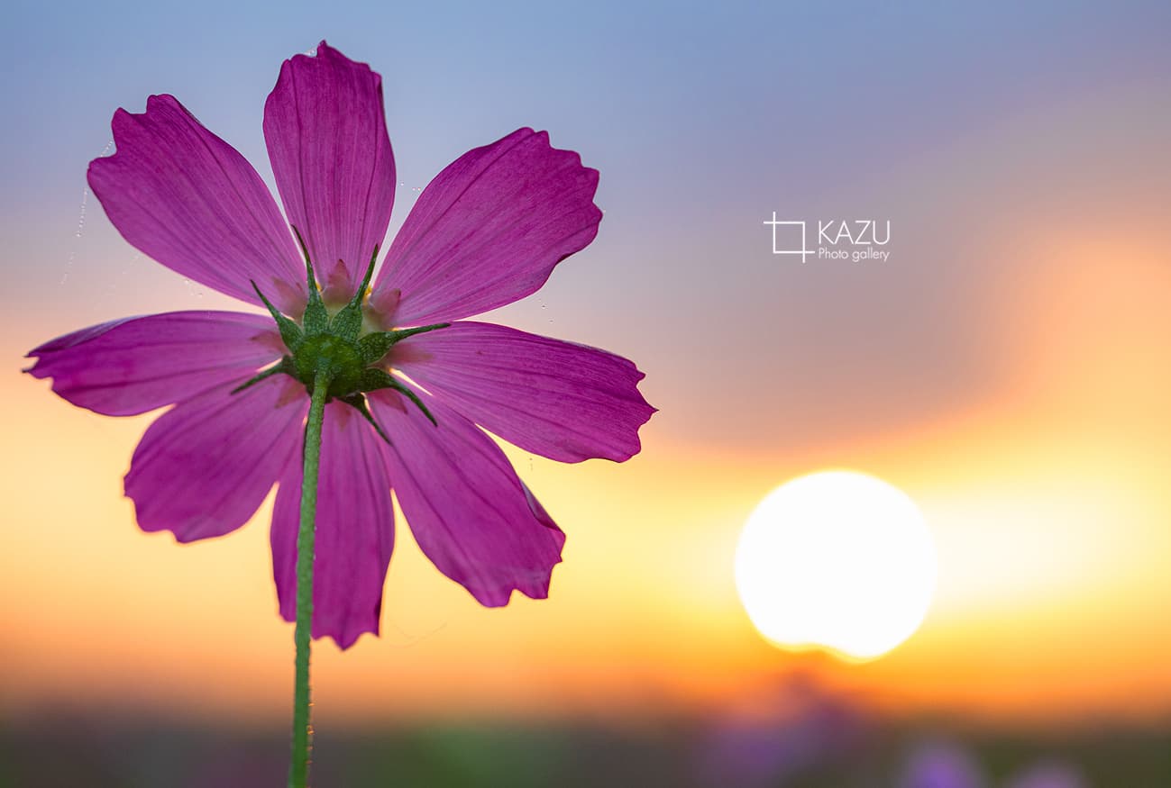 今日は人が全然いません、天気予報のせいか公園が月曜日休みのせいか7時になると2〜3人いた撮影者も帰ってしまって私一人です、私一人のコスモス畑。