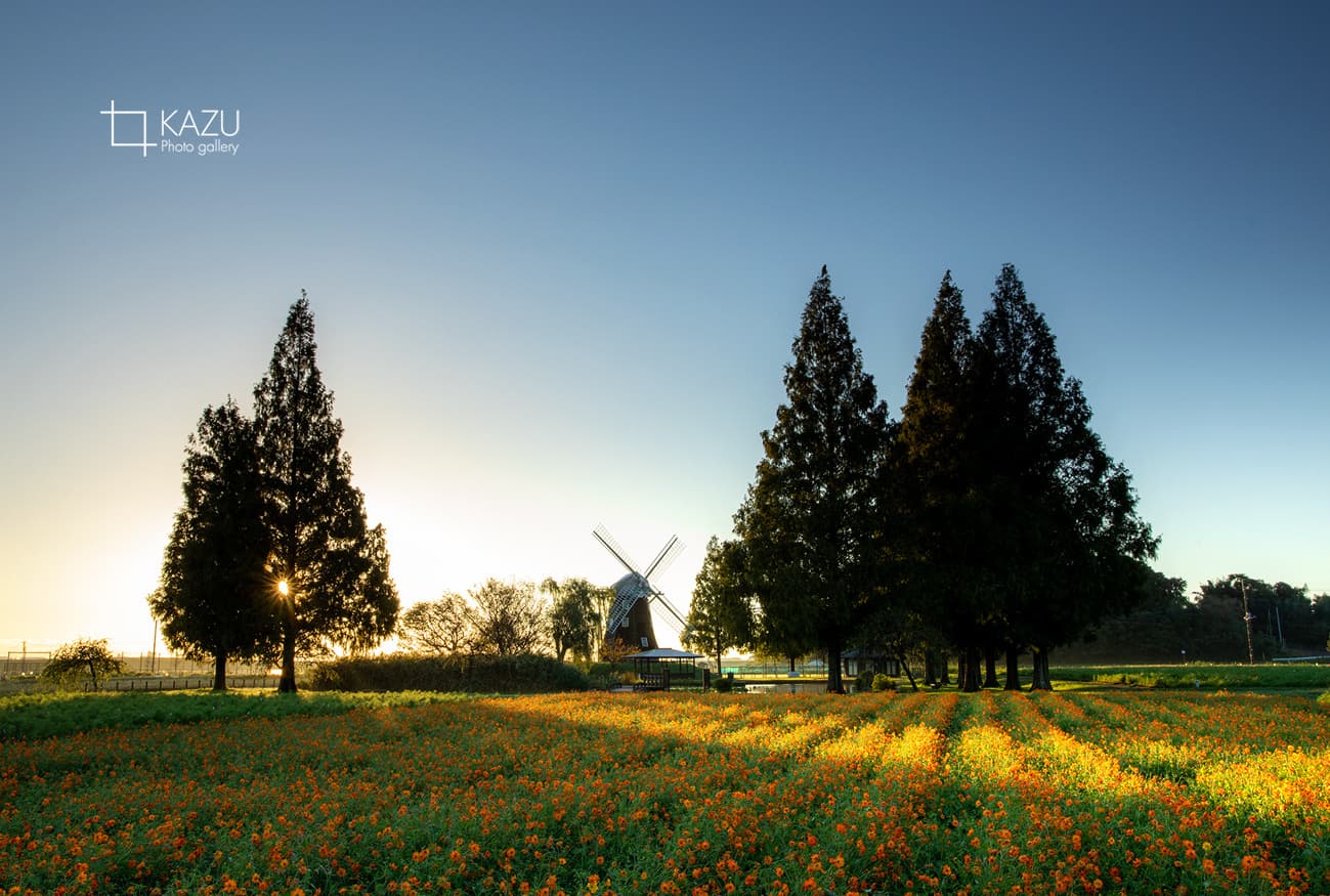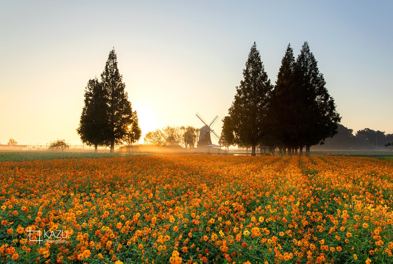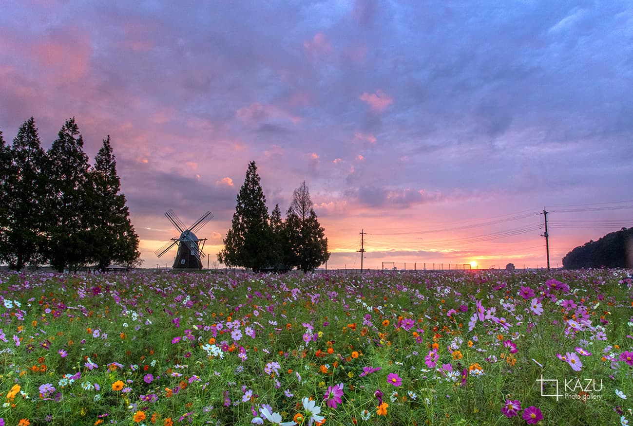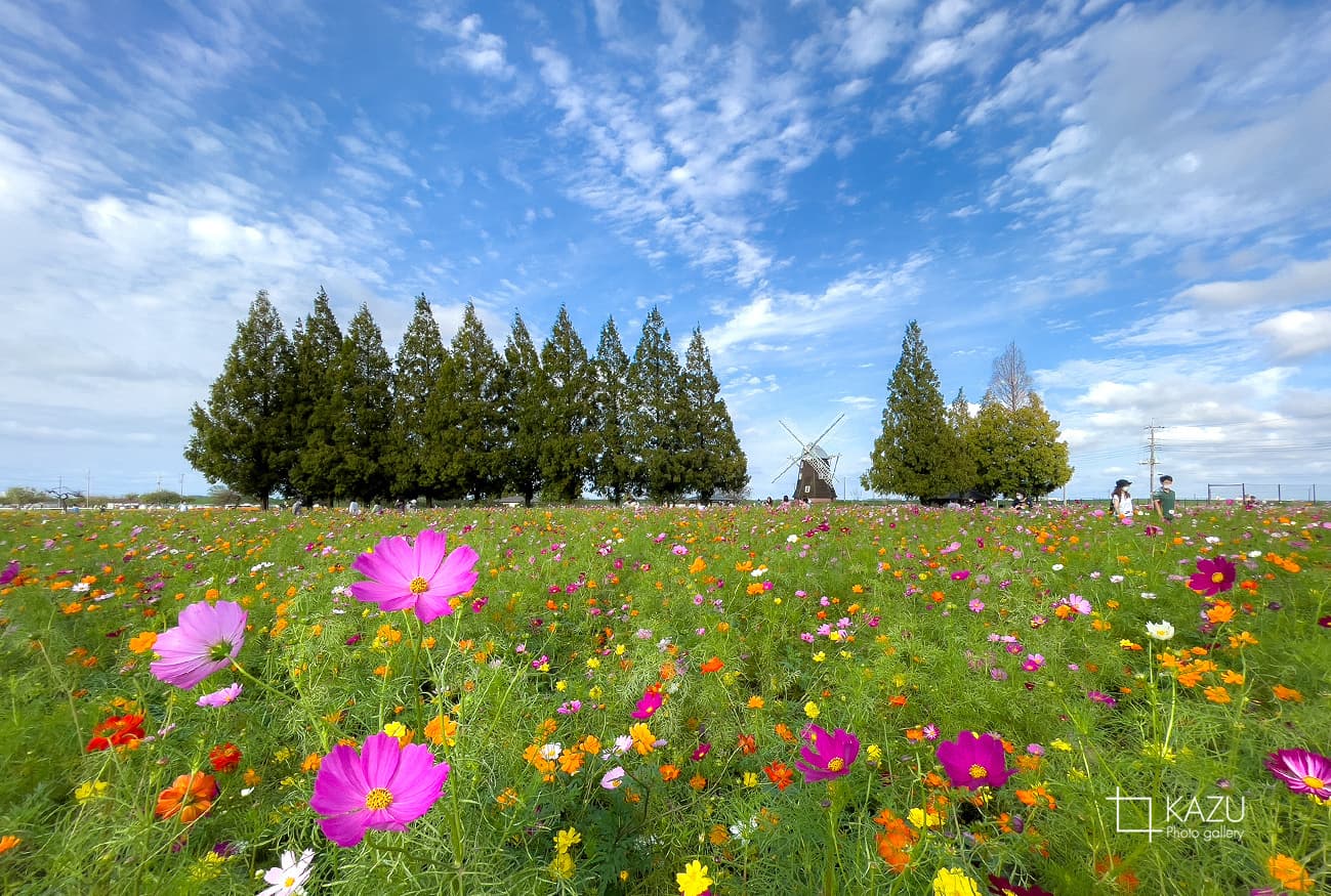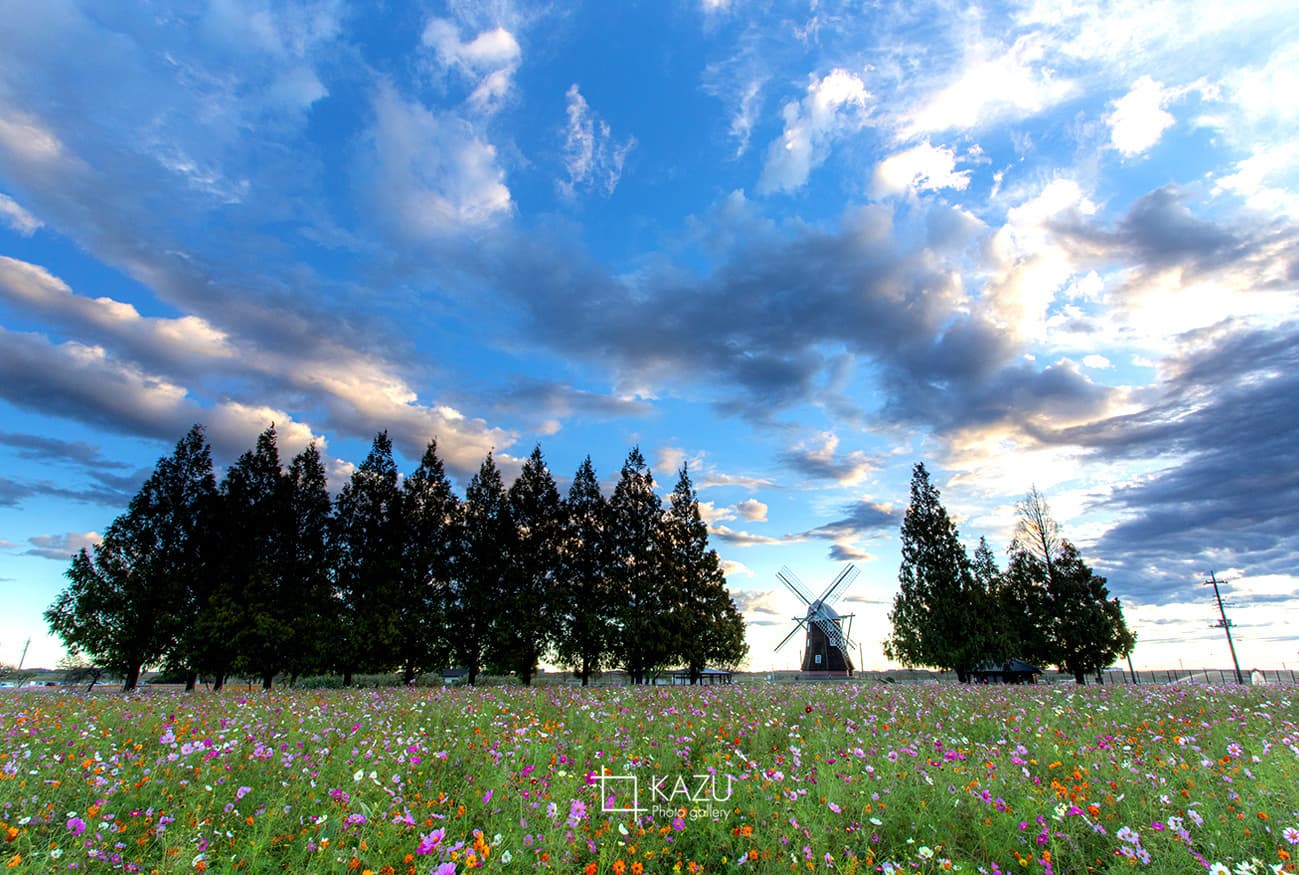 風車はキバナコスモス側です