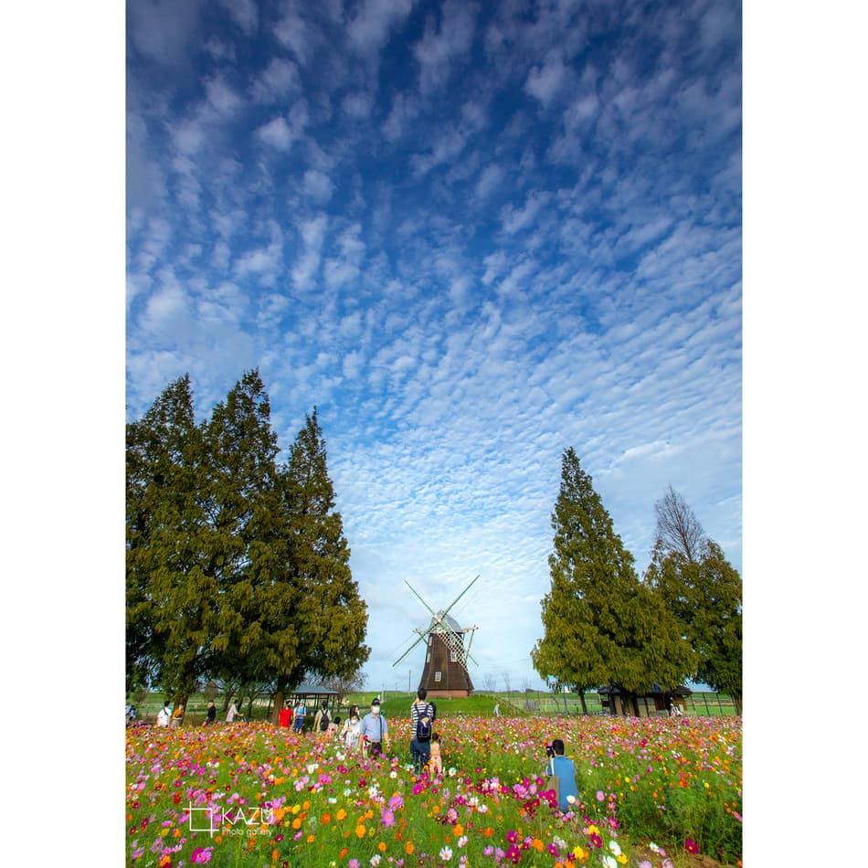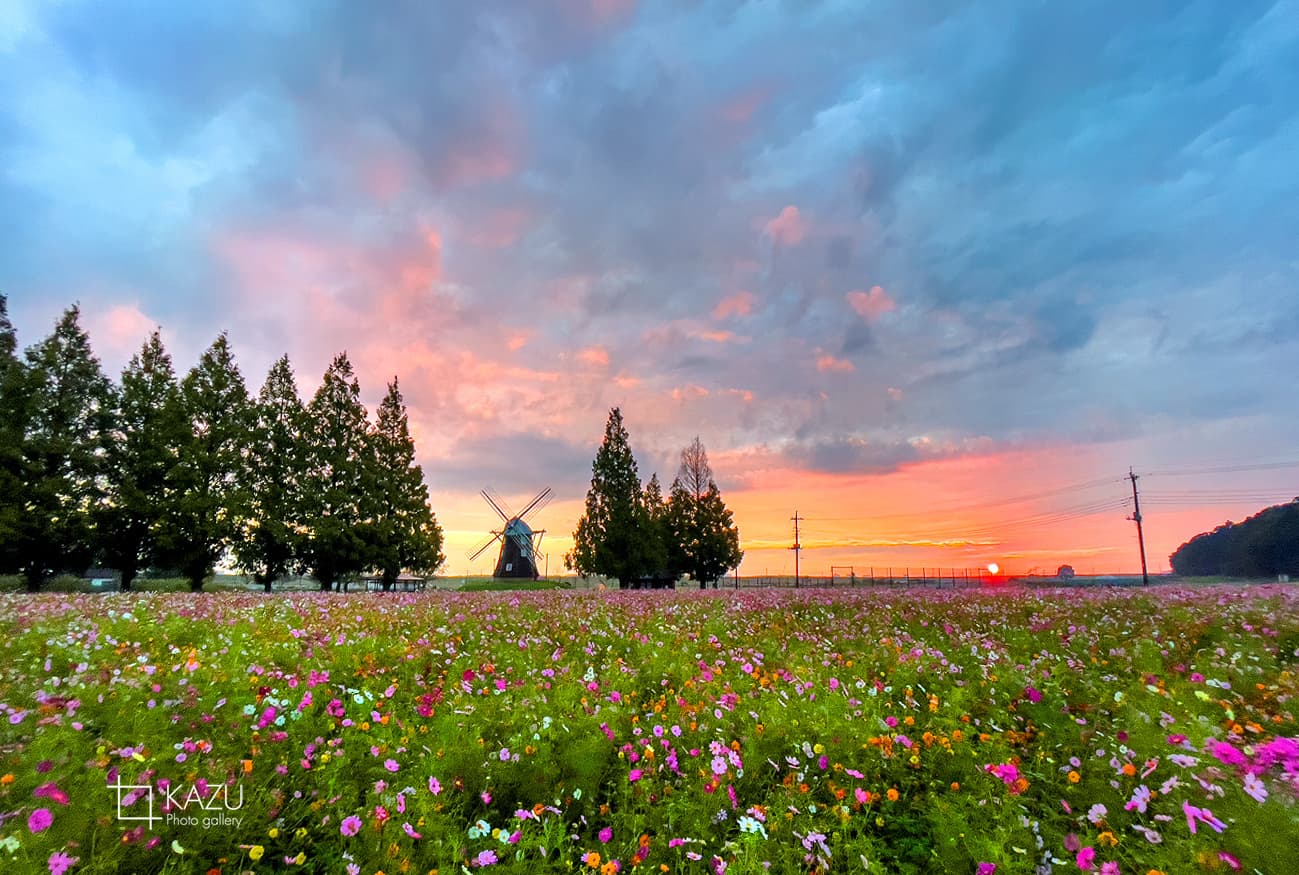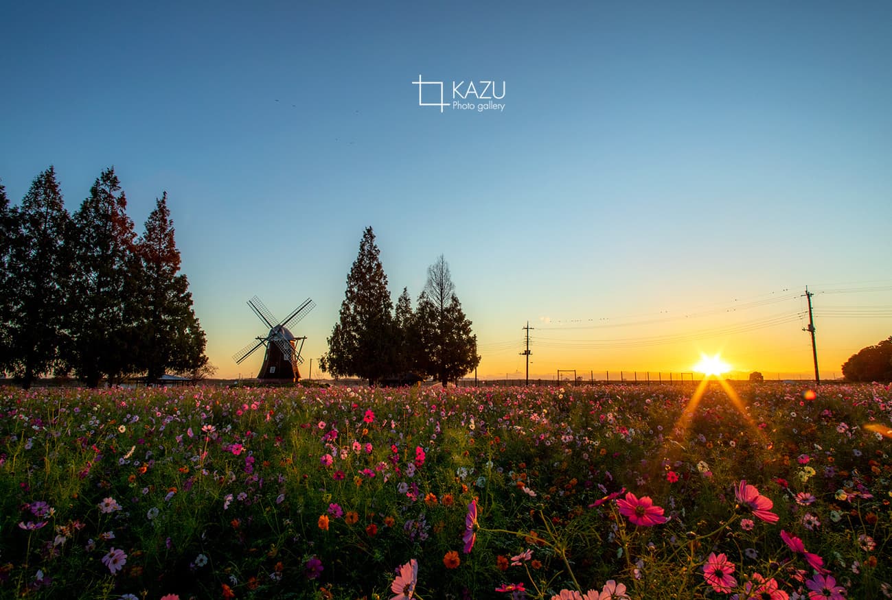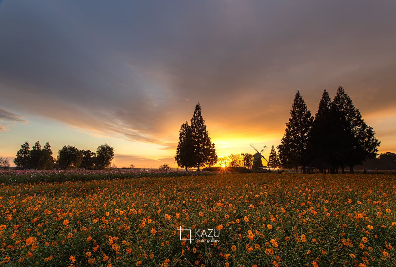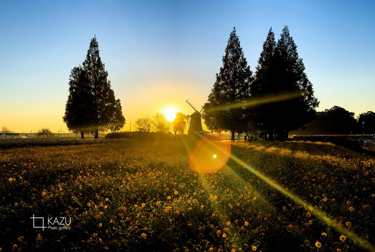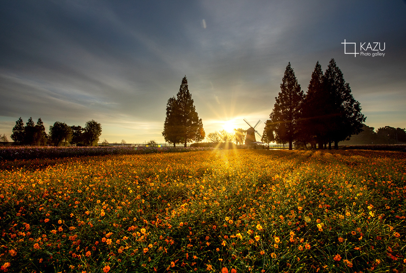 風車はキバナコスモス側です