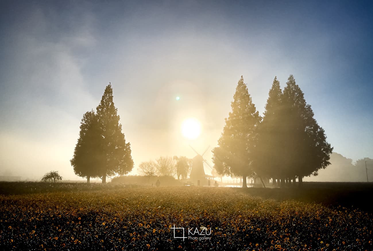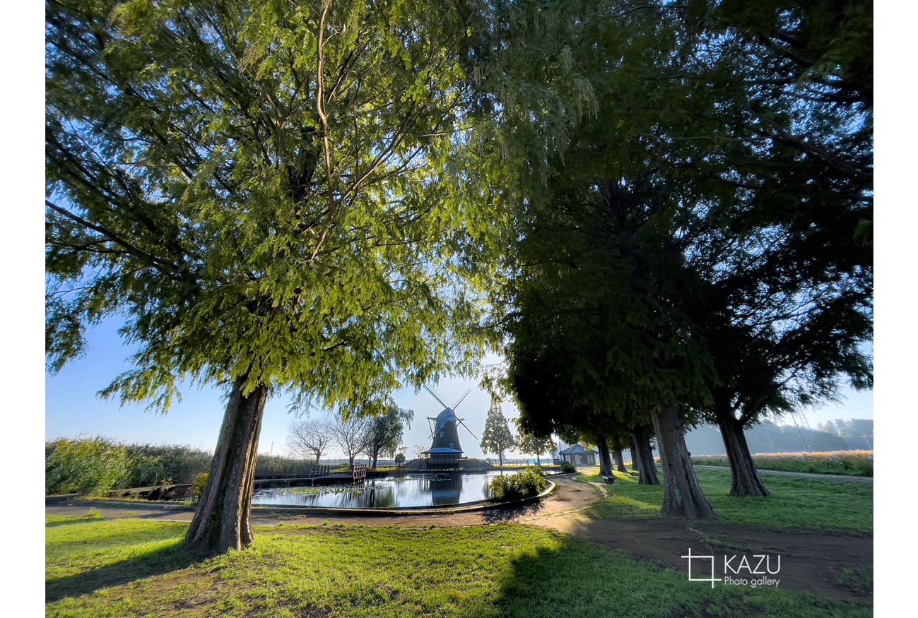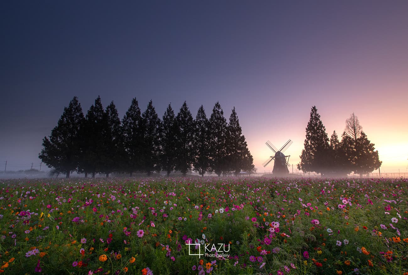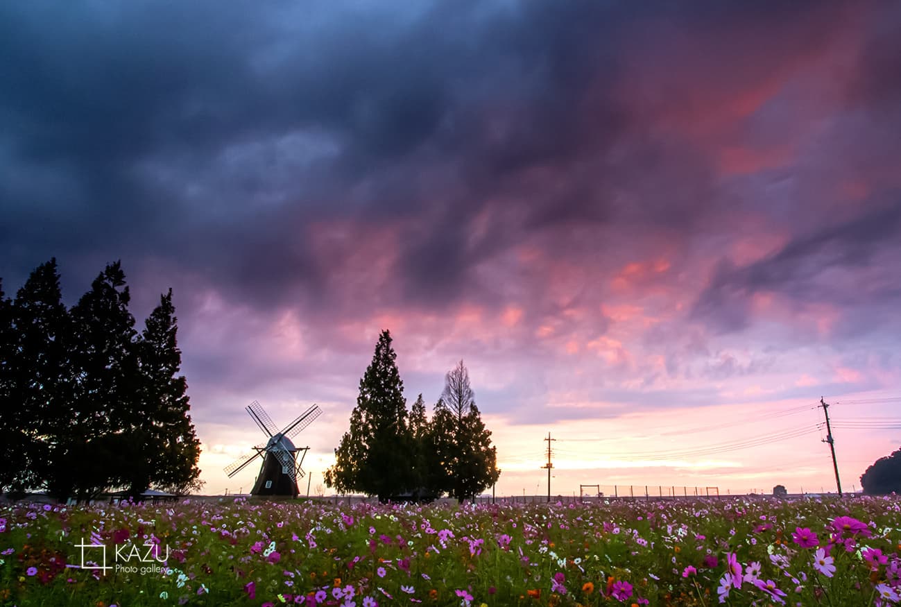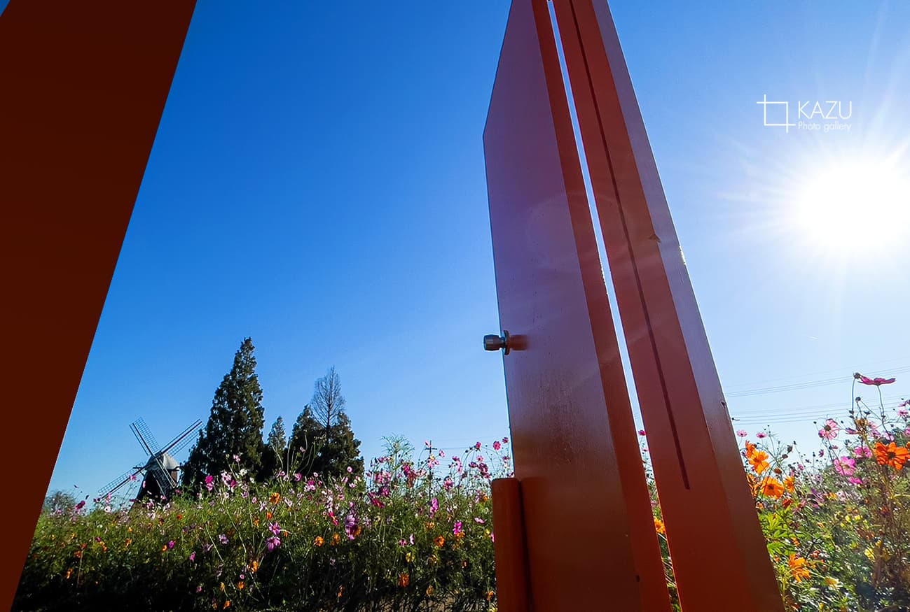 風車はキバナコスモス側です