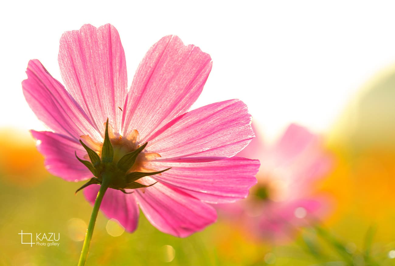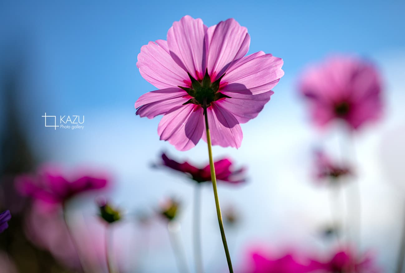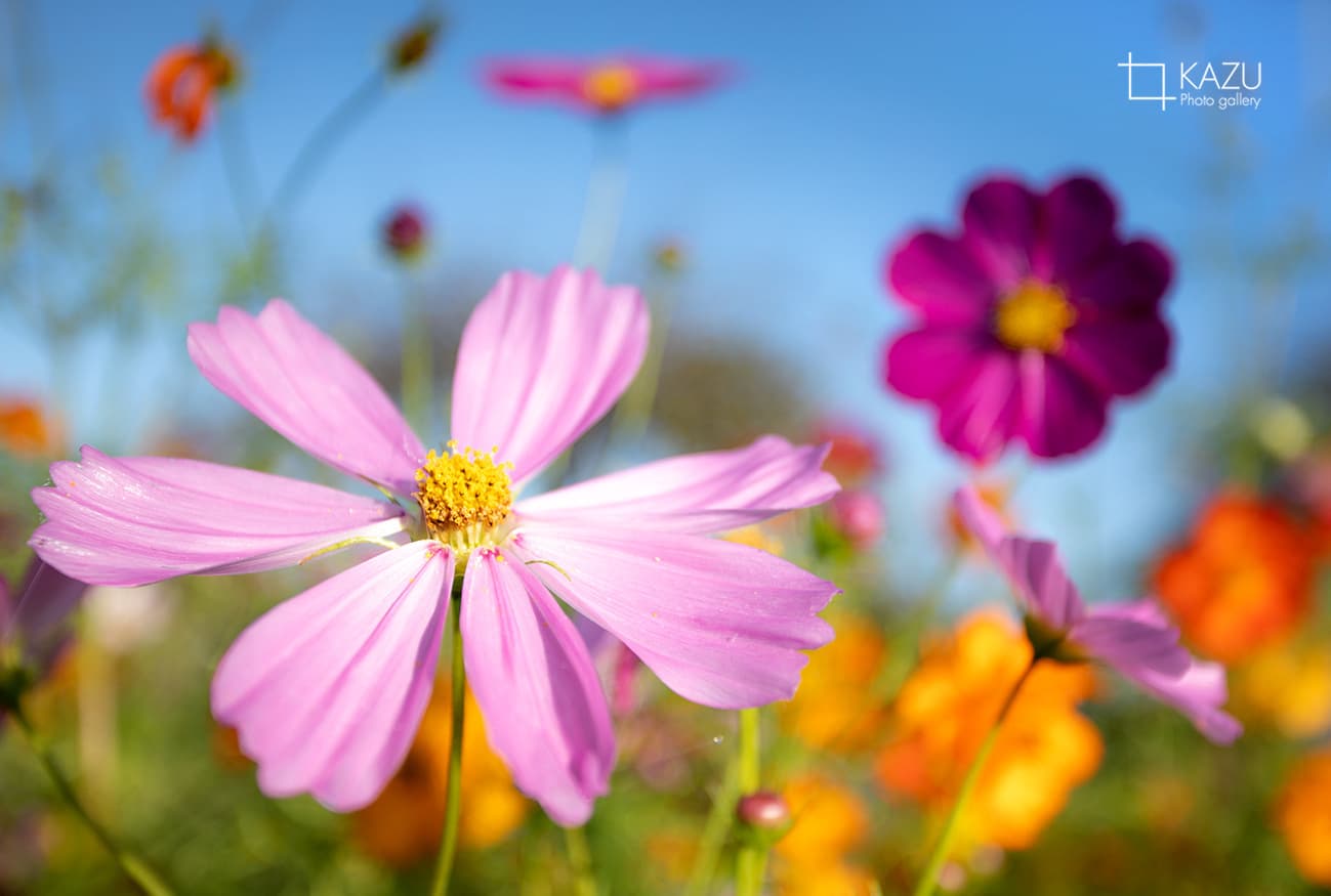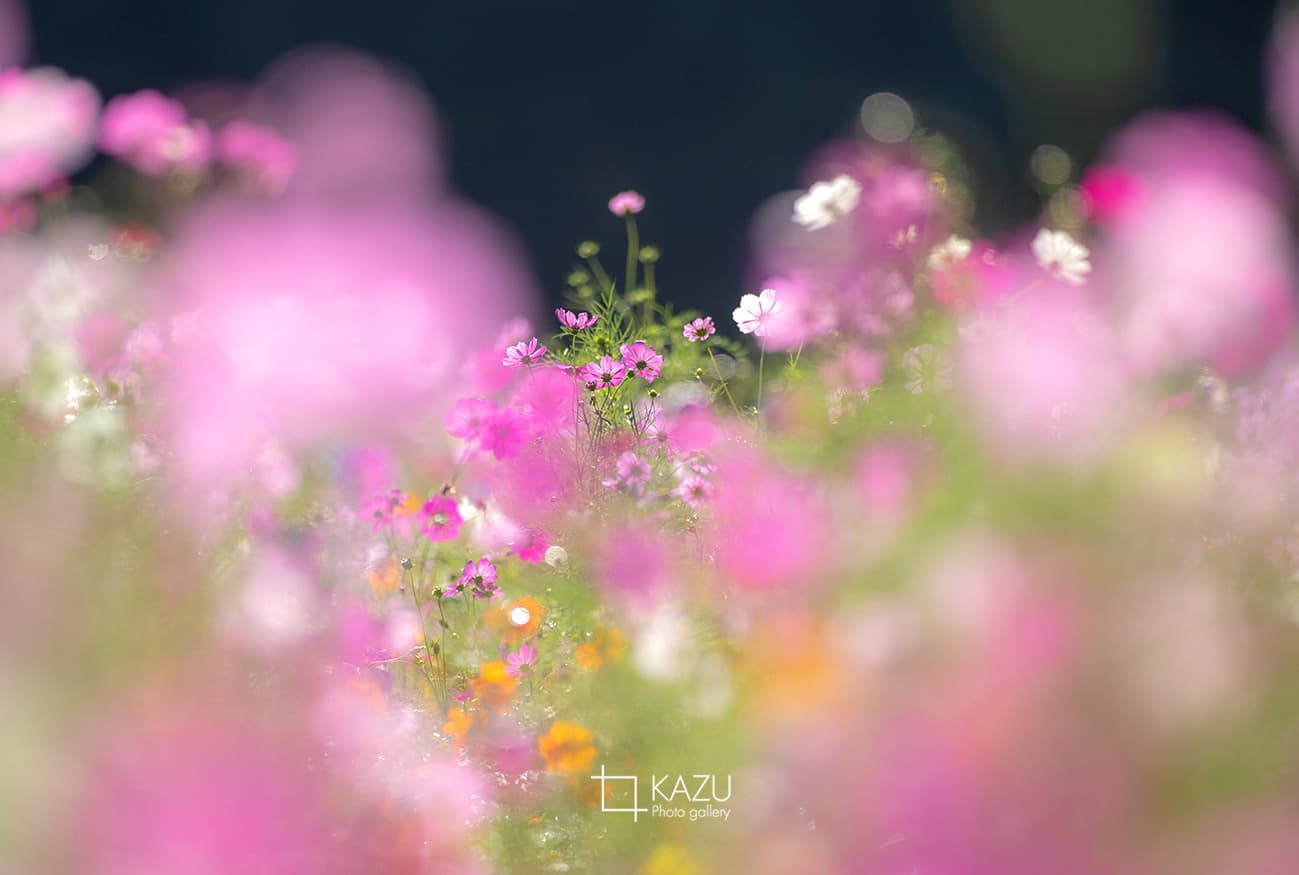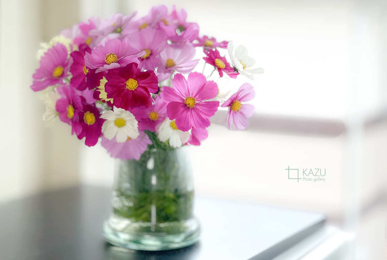 コスモスの摘み取りまであと5日、咲き終わった花など映り込むと汚いものをハサミで整理しながら写真を撮ってみましょう。