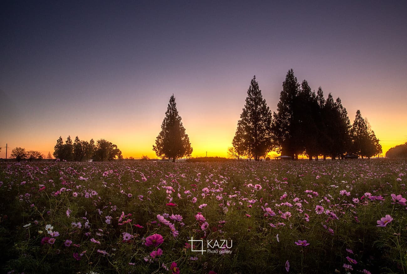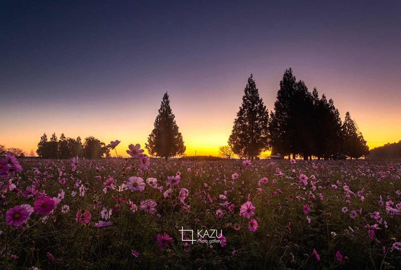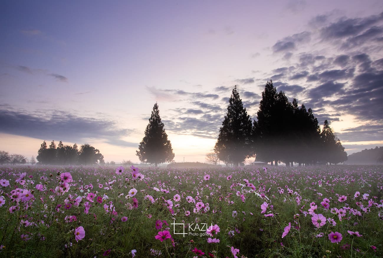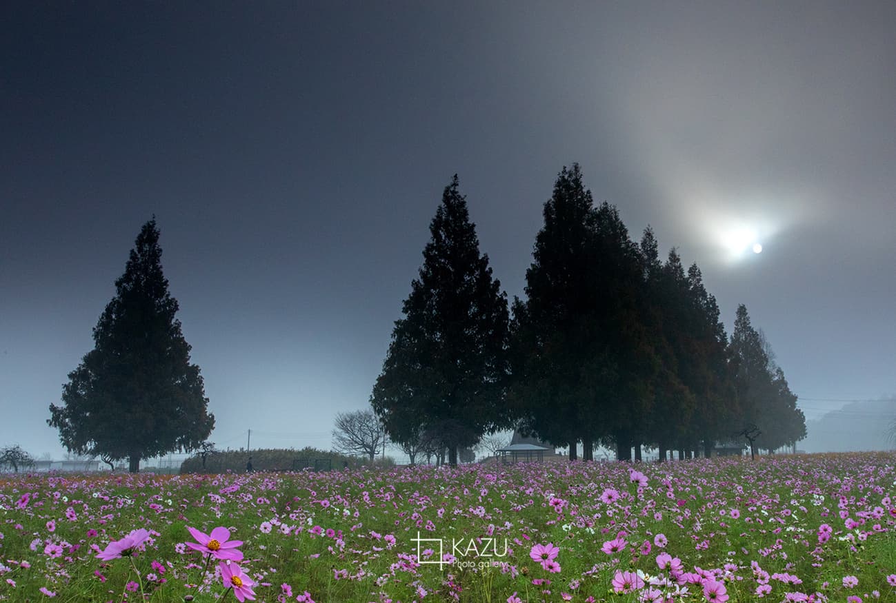 霧予報が出ていたので又々あけぼの山公園のコスモスまで、日の出前40分前、早いかなと思いながら行って見ると結構人がいました皆考えることは一緒です。