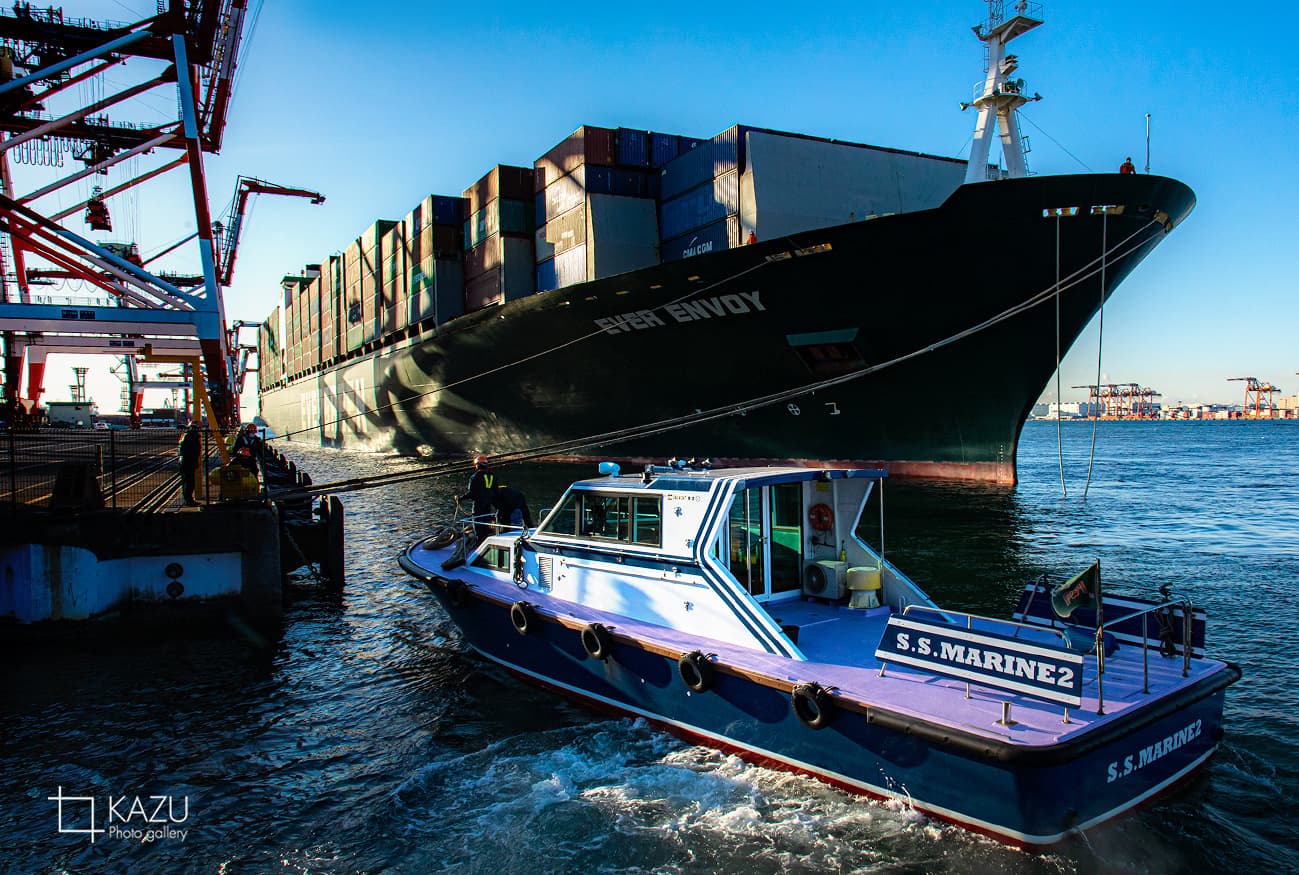 どうやってロープを岸壁に渡すのだろうかと思い映像で大砲みたいに撃ち込むのをみた事があるのでどうするのかと眺めていたら小さな船が持っていくのでした
