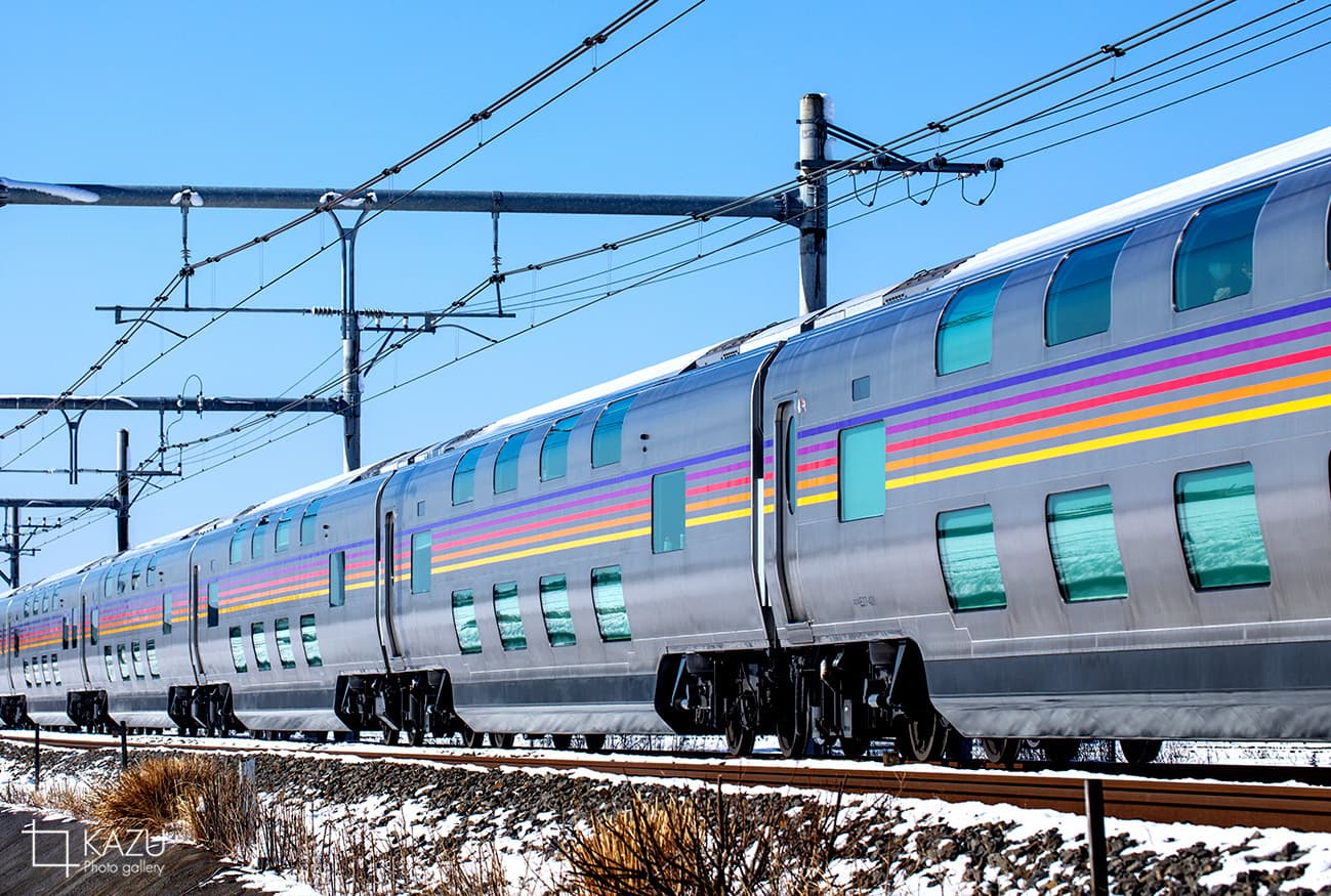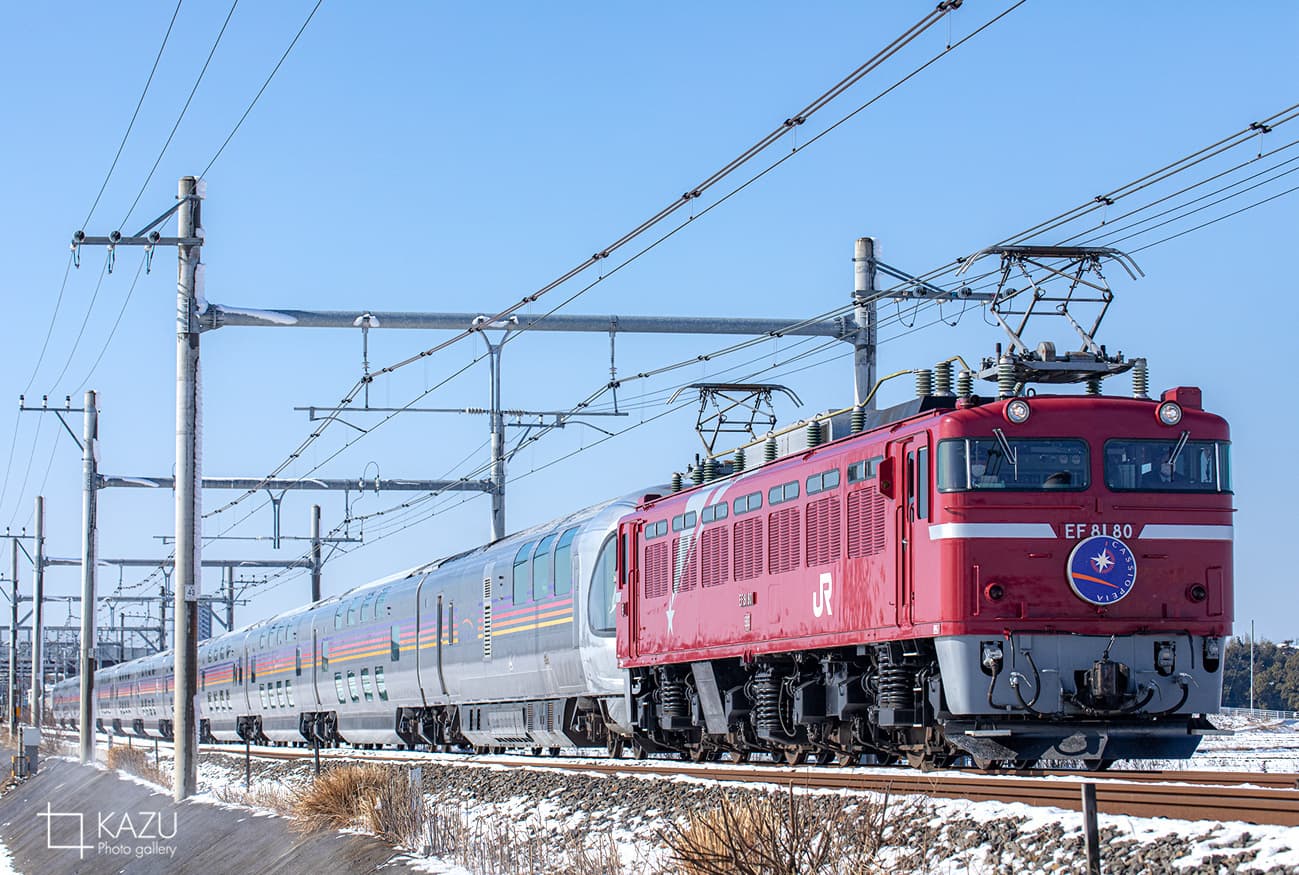 カシオペア紀行仙台行きが常磐線経由でやってくるので朝の4:30に家を出て撮影、雪による倒竹の影響で大幅に遅れてやってきました正面んは陽が当たらず黒つぶれ現像で修正です