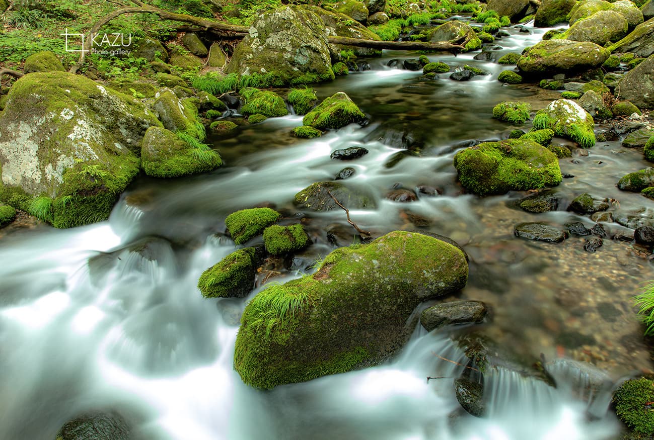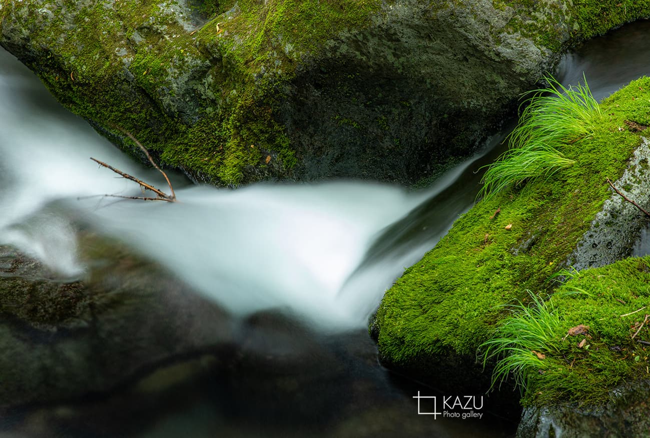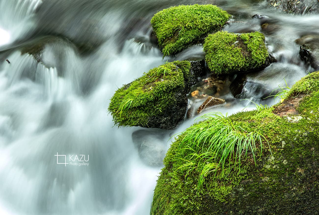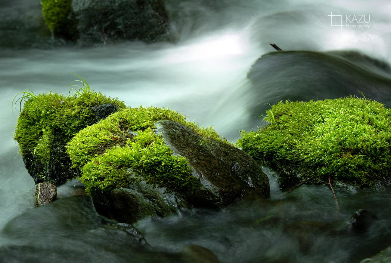 家の玄関や庭に生えるの苔はいやだけれど沢の苔はとても綺麗、水に洗われて瑞々しい